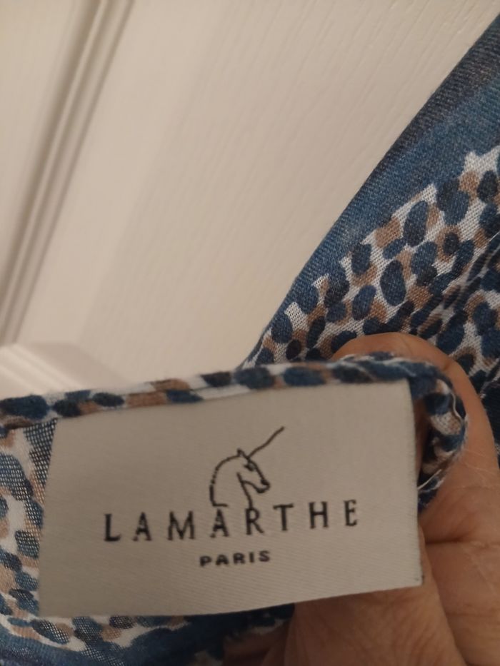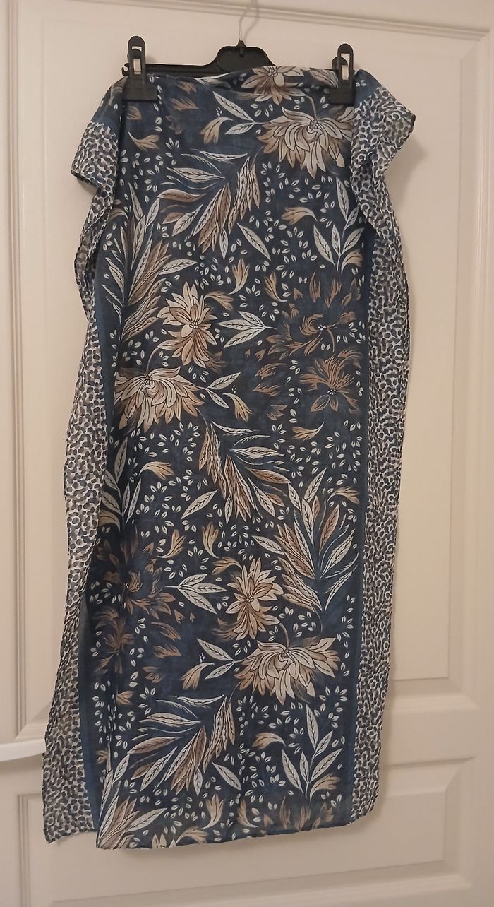 Grand foulard fleuri bleu multicolore, en polyester, pas servi. 50 cm de largeur 1,80 m de longueur