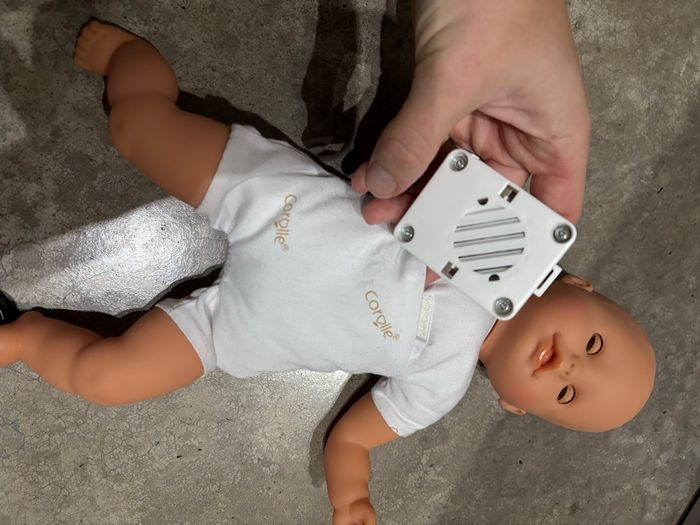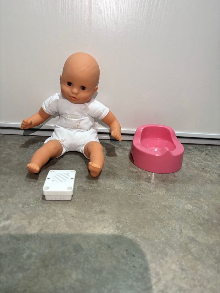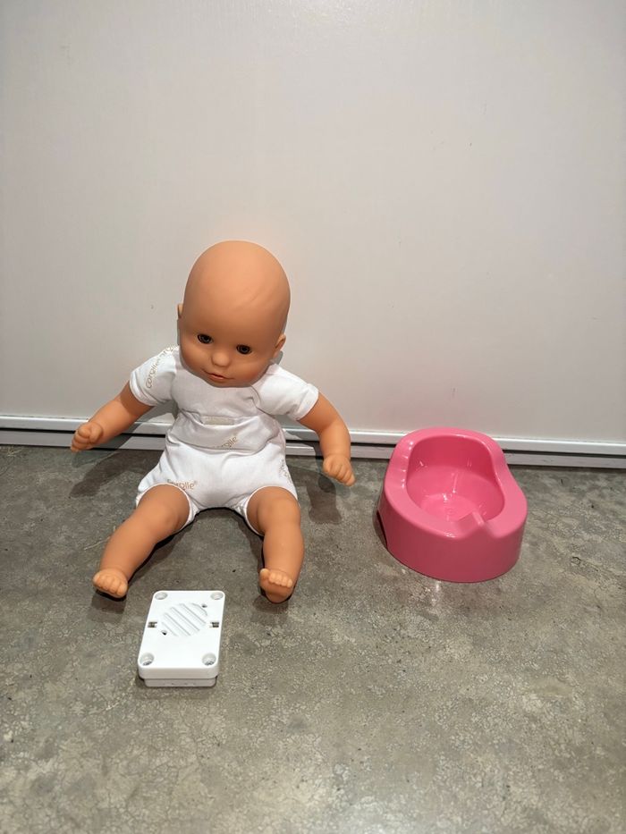 Poupon interactif avec plusieurs mélodies, le boîtier peut s’enlever. Vendu avec un pot. Bébé de la marque corolle en très bon état. Le prix n’est pas négociable