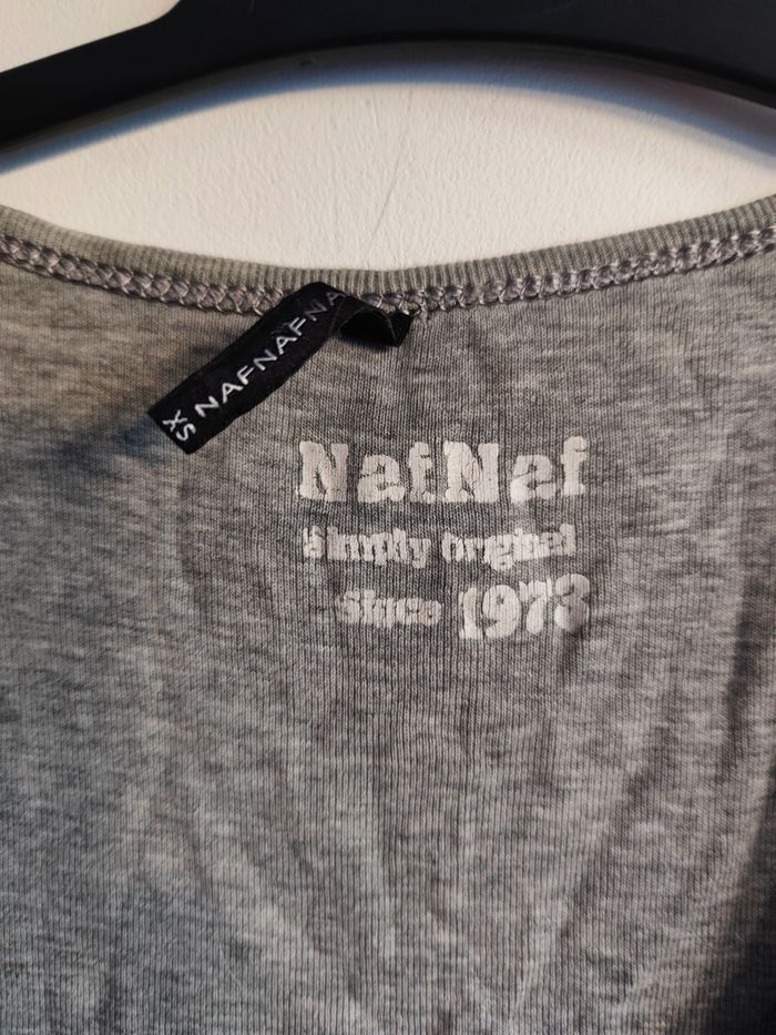 Débardeur Naf Naf gris chiné en taille XS, coupe près du corps agréable à porter, parfait en basique du quotidien. Modèle sans manches avec col rond et finitions simples, facile à associer (jean, short, jupe) ou à porter sous une veste/gilet. Tissu doux et léger, idéal pour la mi-saison ou l’été. #femmevale62100 #hautvale62100 #tailleXSvale62100 #nafnaf #debardeur