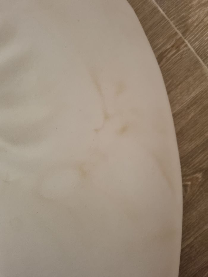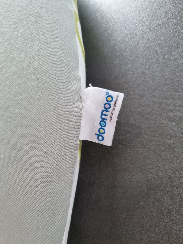 Grand coussin d'allaitement Doomoo encore bien rembourré. La housse extérieure passe en machine (pas de tâches). Le tissu blanc en-dessous présente des traces (voir photos car frotté à la main) d'où le petit prix.