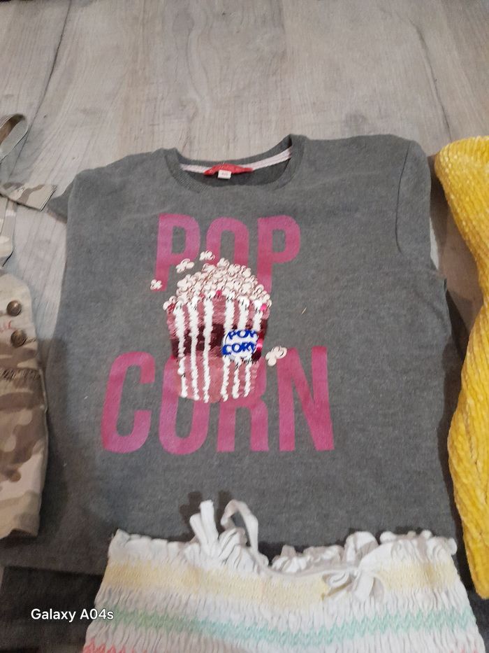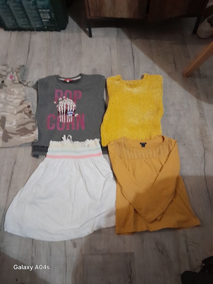1swet manches longues 1 pull tout doux couleur moutarde theeshirt manches longues tunique jupe à bretelles motif militaire taille 4/5 en très bonne état