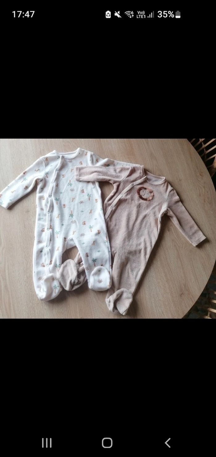 Lot de deux pyjamas en velours, ouverture par pressions à l'avant. Un beige motif lion, un blanc imprimé animaux tropical. Inscription taille 9 mois 71 cm. Peu portés, lavés avec lessive bébé à 30 degrés et désinfectés. #pyjama9moisgarcon #pyjamabebegarcon9mois #lotpyjama9moisgarcon #lotpyjamapressionsavant9mois