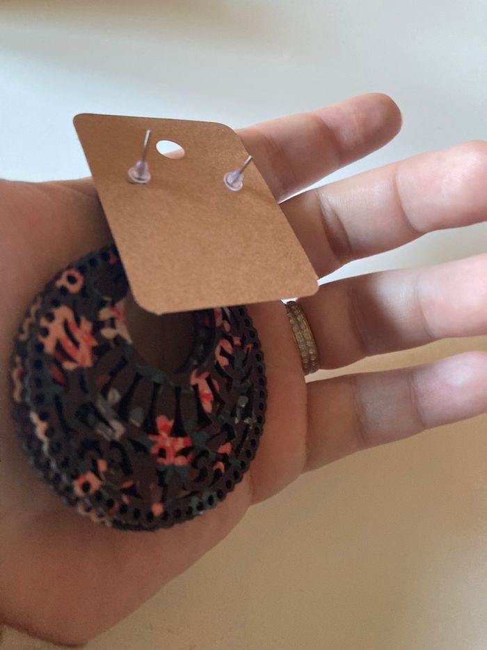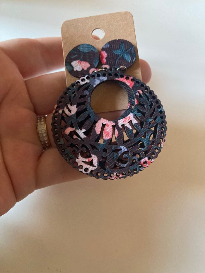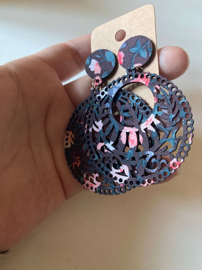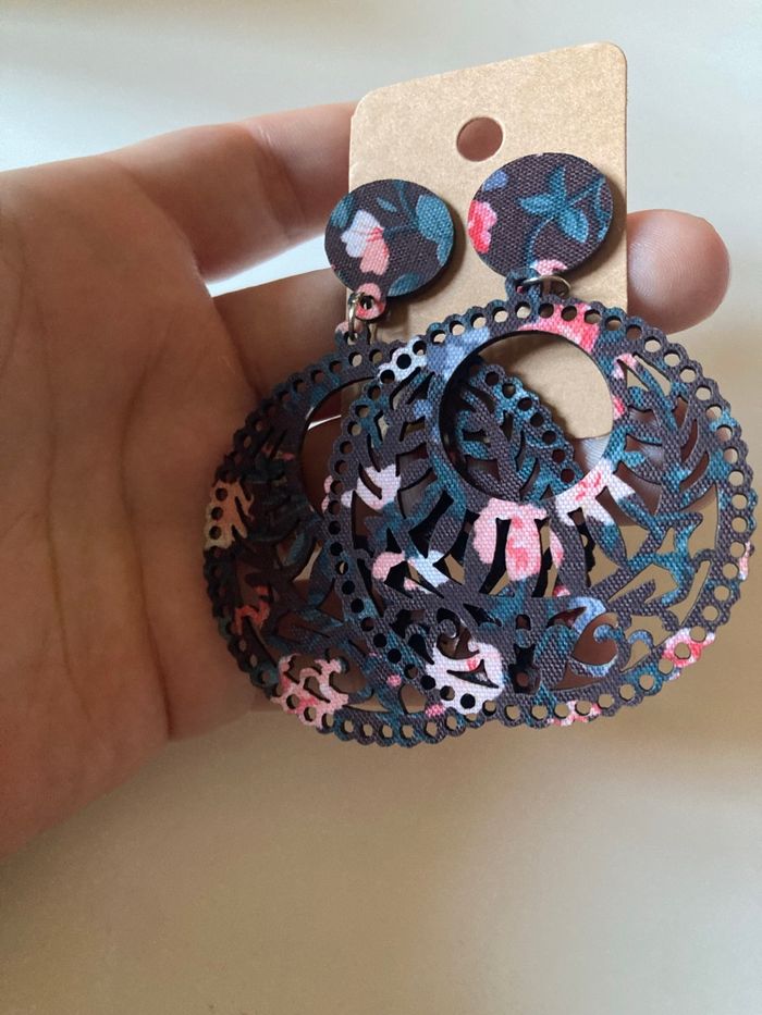 DRESSING PROPOSANT RÉDUCTIONS 💶😀 Boucles d’oreilles pendantes pour femme, de forme ronde. Avec motifs floraux 🌸. Pour oreilles percées. Matière : En bambou Couleurs : Noir avec des touches de rose et de bleu. TRÈS LÉGÈRES DIMENSIONS : 7,5 cms de hauteur 5 cms largeur ✨NEUVES avec étiquette. Jamais portées.✨ Prix : 2€99 Je dépose DANS LA MESURE DU POSSIBLE les colis 📦 le lendemain du paiement. 😉 MAIS SI CEST UN ENVOI URGENT, MERCI DE ME LE PRÉCISER ☺️. N’hésitez pas à jeter un coup d’👀 à mes évaluations. 🙂