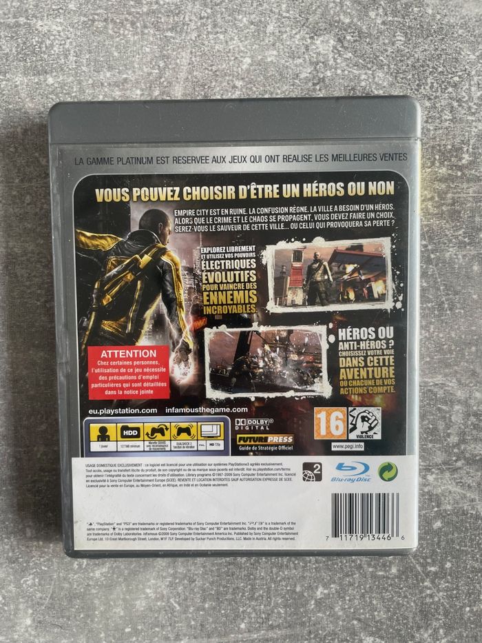 Jeu pour Sony PS3, Infamous édition platinum en français. Bon état. Complet avec boite et notice. Envoi rapide et soigné. Consultez mes autres articles pour de moindres frais de port.