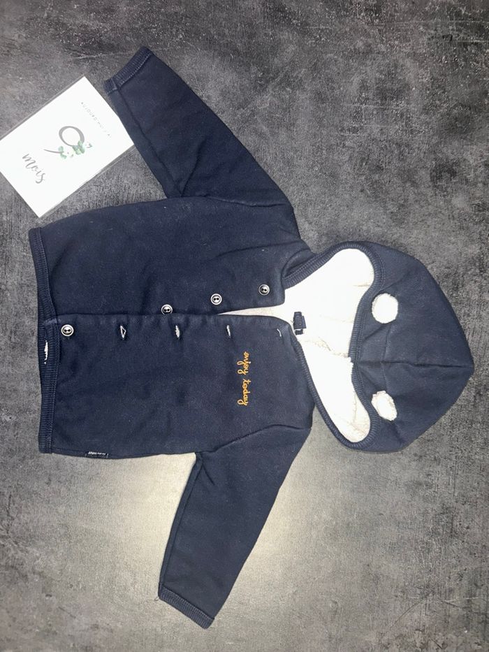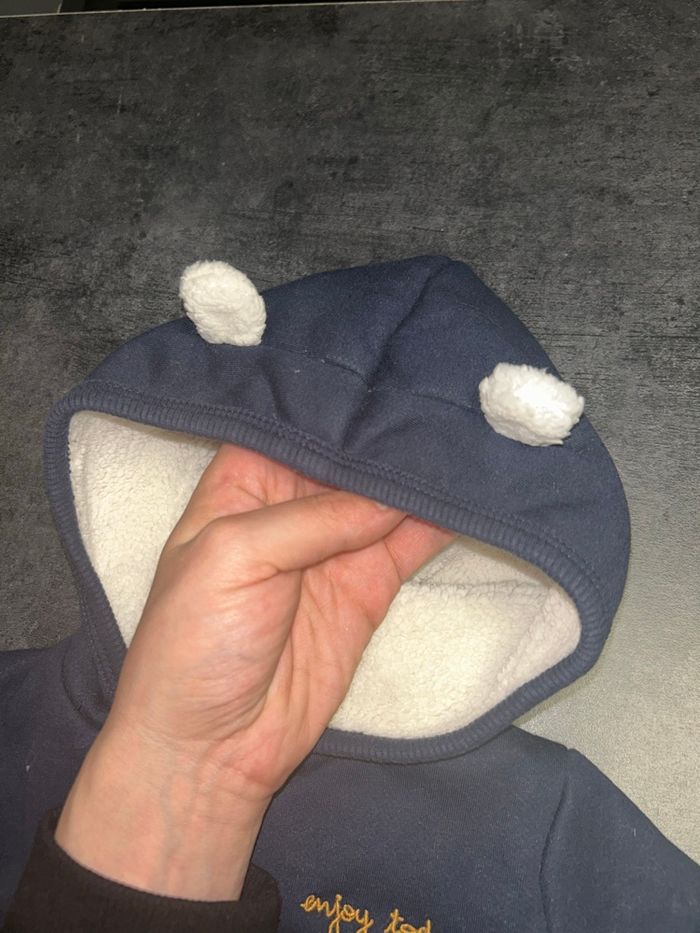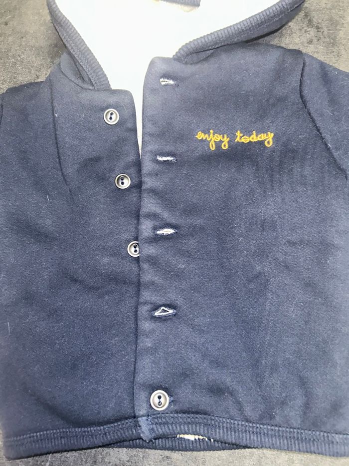 Veste polaire bébé avec capuche Couleur bleu marine Écriture « enjoy today » Fermeture par boutons Taille : 9 mois / 69-72 cm / 9 kg