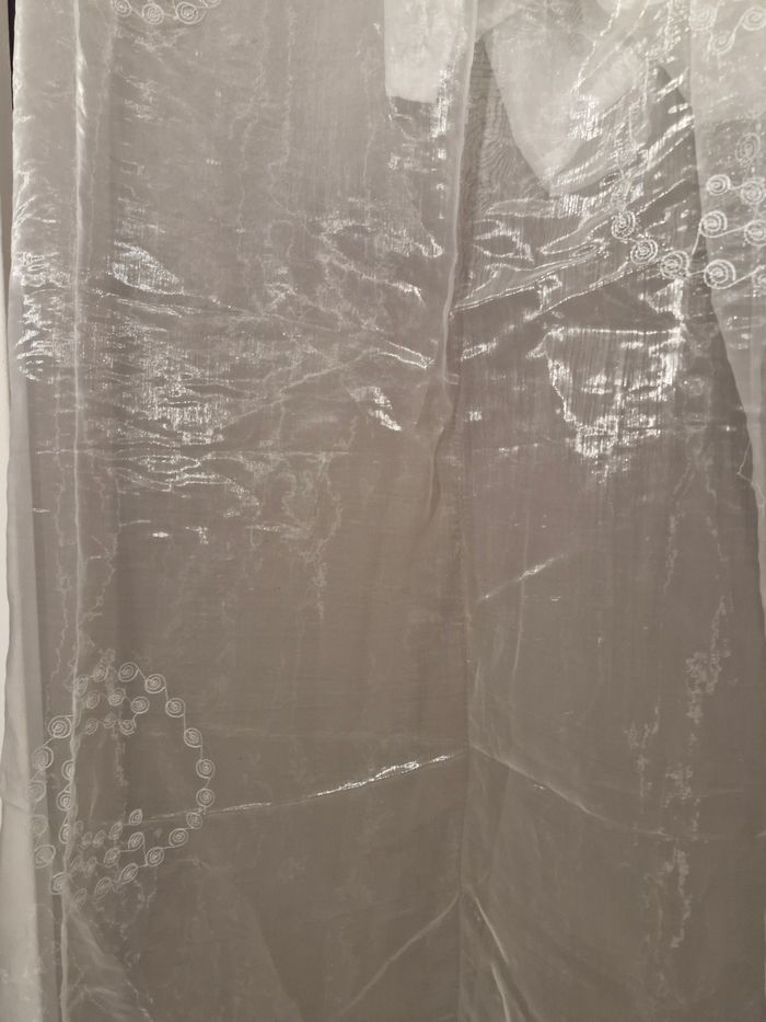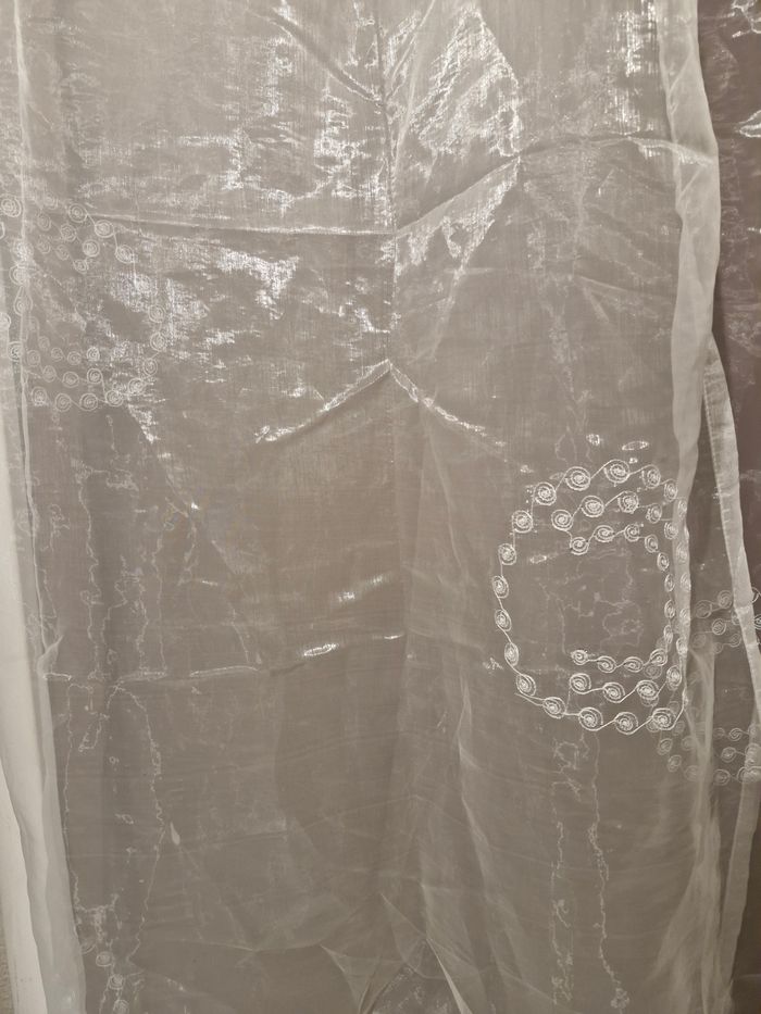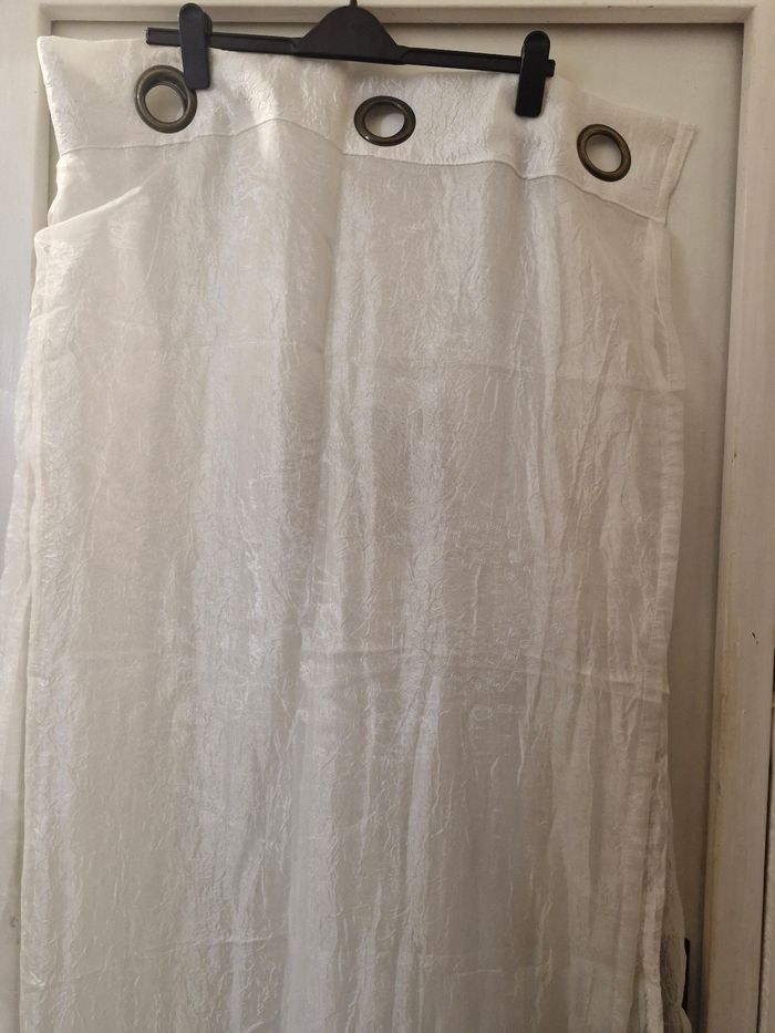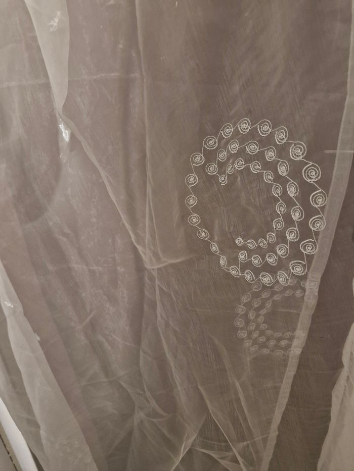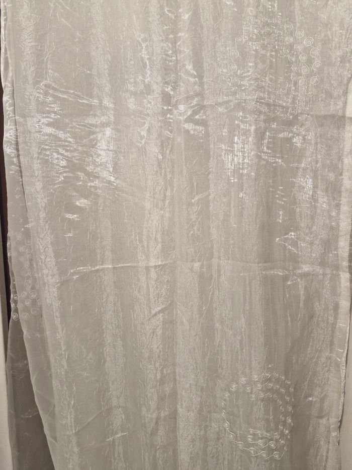 Voilage doublé pour fenêtre Velux – Blanc / écru 📏 Dimensions : 150 x 240 cm 🪟 Vendu à l’unité (1 panneau) Voilage doublé en tissu léger et légèrement satiné, coloris blanc/crème. Motifs brodés discrets en cercles, apportant une touche élégante et lumineuse. Œillets métalliques ronds pour une installation facile sur tringle. Idéal pour fenêtre Velux ou grande fenêtre, laisse bien passer la lumière tout en préservant l’intimité. ✔ Bon état général ✔ Propre, sans trou ni accrocs visibles ✔ Maison non-fumeur