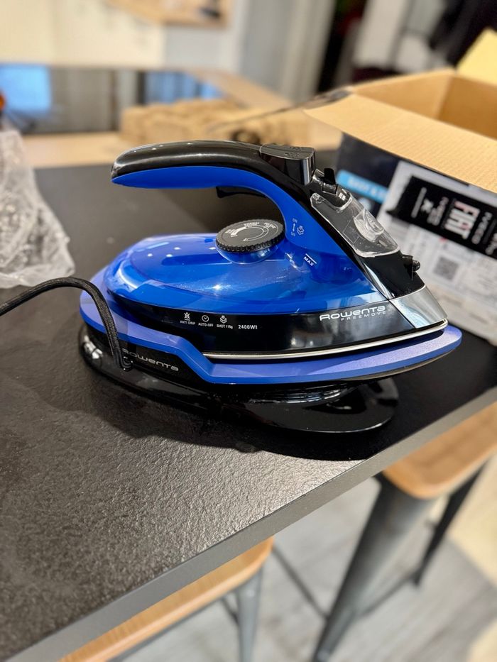 🔥 Rowenta Freemove Air – Le fer à repasser SANS FIL qui change tout ! 🔥 Libérez-vous du fil ! Grâce à sa technologie 100% sans fil, ce Rowenta offre une liberté totale de mouvement et un repassage ultra agréable. Puissant (2400W), léger, ergonomique et toujours prêt grâce à sa recharge instantanée sur la base. Il dispose de toutes les fonctions haut de gamme : ✔️ Anti-goutte (zéro taches) ✔️ Anticalcaire (durée de vie prolongée) ✔️ Arrêt automatique (sécurité) ✔️ Voyant intelligent de recharge ✔️ Réglage manuel vapeur & température Couleur Noir & Bleu, dimensions 27 x 12 cm. Réparabilité 15 ans, garantie 2 ans. 💨 Un repassage plus simple, plus propre et plus rapide ! Parfait état, prêt à l’emploi.