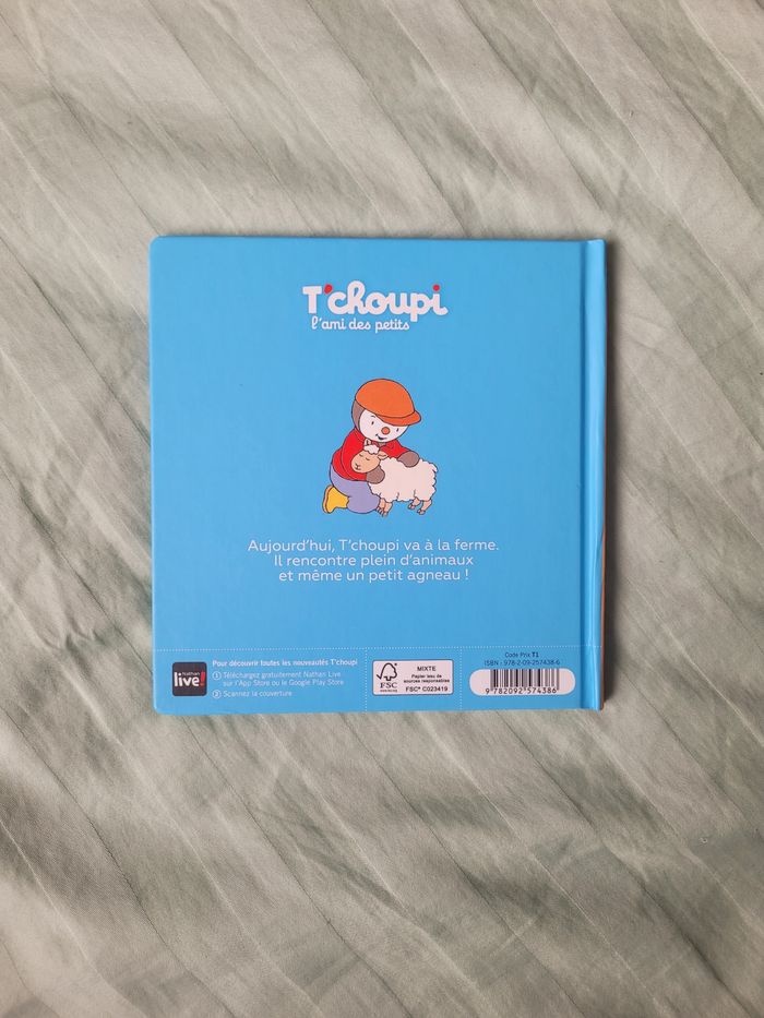 🚜 T'choupi va à la ferme – Une aventure toute ! 🐑 ​Faites découvrir les joies de la campagne à vos tout-petits avec le plus célèbre des pingouins ! Dans cet album de Thierry Courtin, T'choupi part à la rencontre des animaux de la ferme pour un moment de tendresse et d'éveil. ​Pourquoi on l'adore ? ​Idéal pour les petites mains : Un format solide et adapté aux jeunes enfants. ​Histoires du quotidien : Des mots simples pour apprendre à nommer les animaux et la nature. ​État impeccable : Comme vous pouvez le voir sur la photo, la couverture est très bien conservée. ​Un classique indispensable de la bibliothèque des petits (et des grands !) pour s'évader avant la sieste ou le dodo. 📖✨
