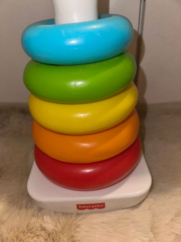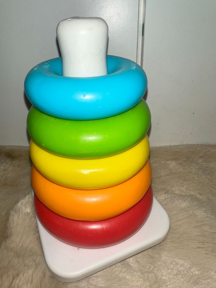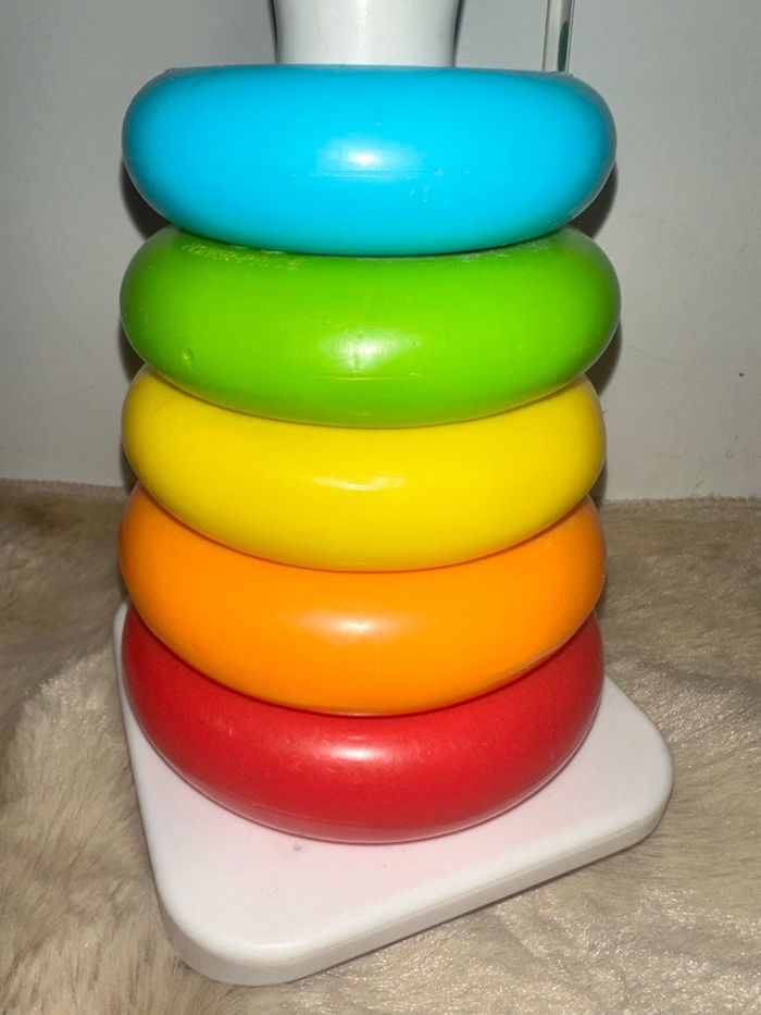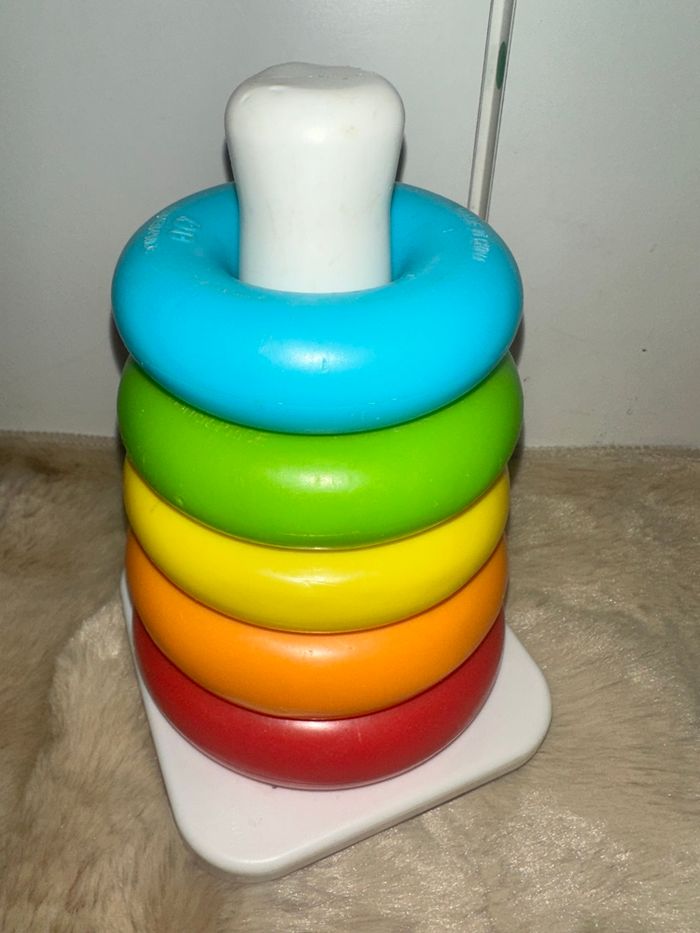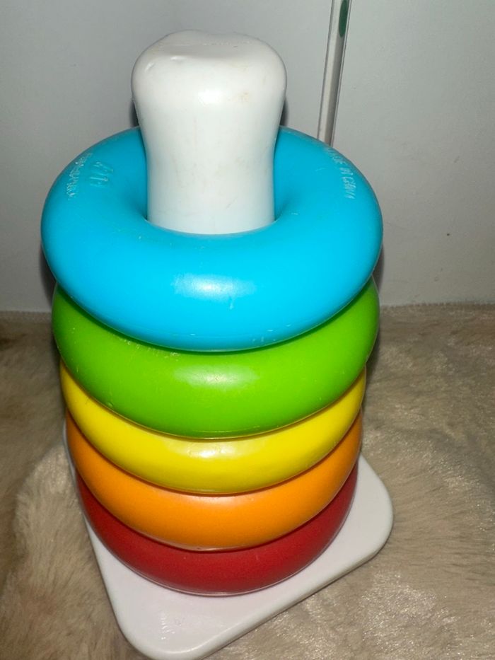 Jouet à empiler classique avec 5 anneaux colorés et une base mouvante, très bon état, marque fisher price Fabriqué à partir de matériaux dorigine végétale #jouetkay57070 #fisherprice