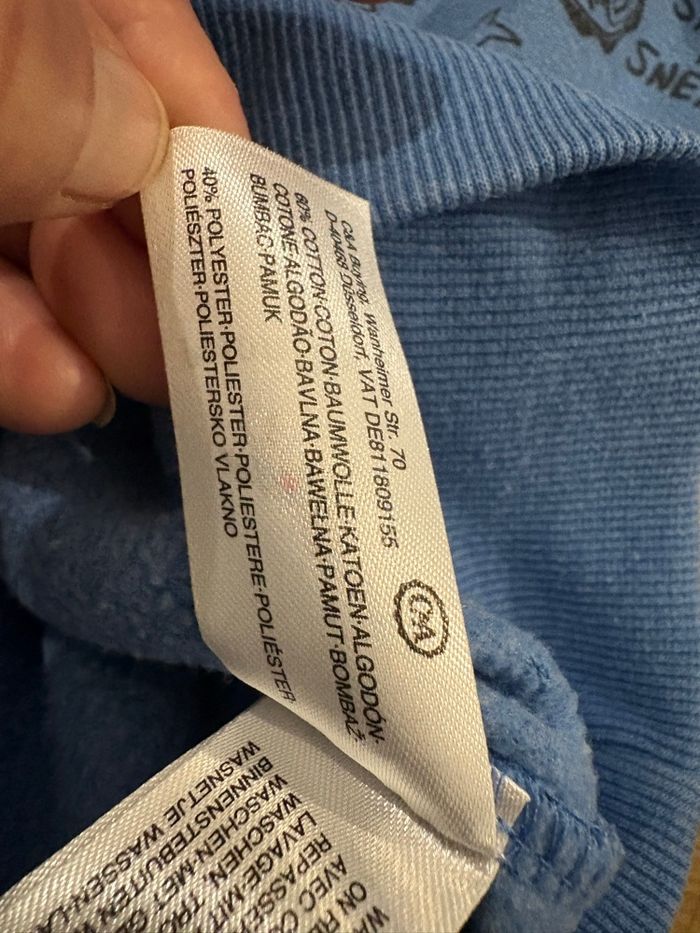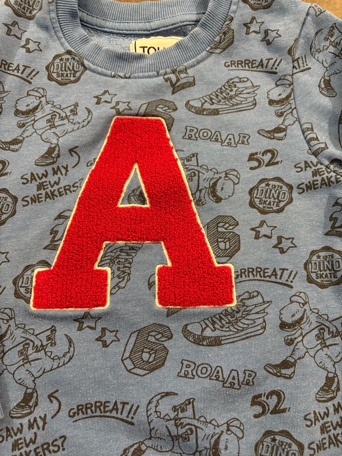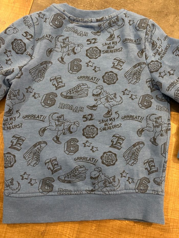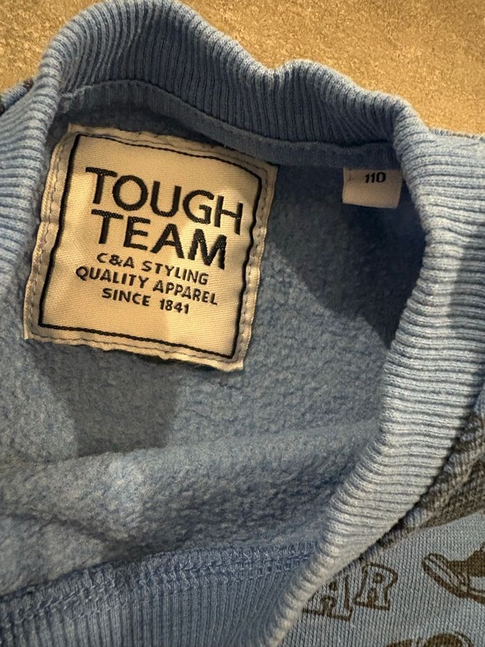 Joli sweat molletonné TOUGH TEAM (C&A), coloris bleu, avec motifs dinosaures/skate et grande lettre A rouge en relief sur le devant. Intérieur tout doux, parfait pour l’école ou les sorties 🌟 ✅ Taille : 110 = 4 ans ✅ Très bon état ✅ Manches longues, col rond Envoi rapide 📦