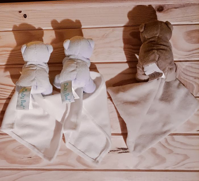 2 doudous oursons bleus avec mouchoir. De Baby Nat'. 1 Doudou ours mouchoir dès la naissance.De Doudou&Compagnie. Remarquablement doux, il deviendra le grand copain de bébé. Il tient dans sa main un petit mouchoir qui lui sert de doudou que bébé pourra facilement attraper avec ses doigts.