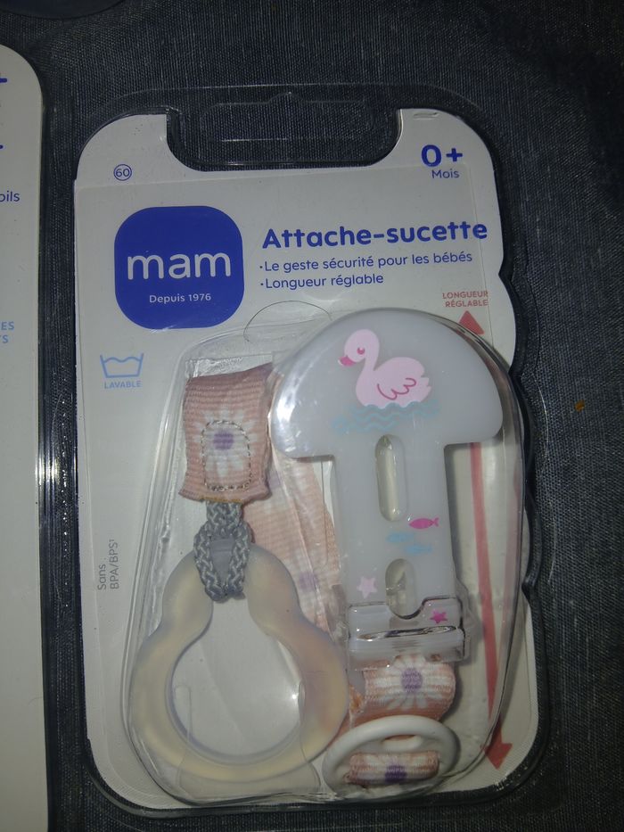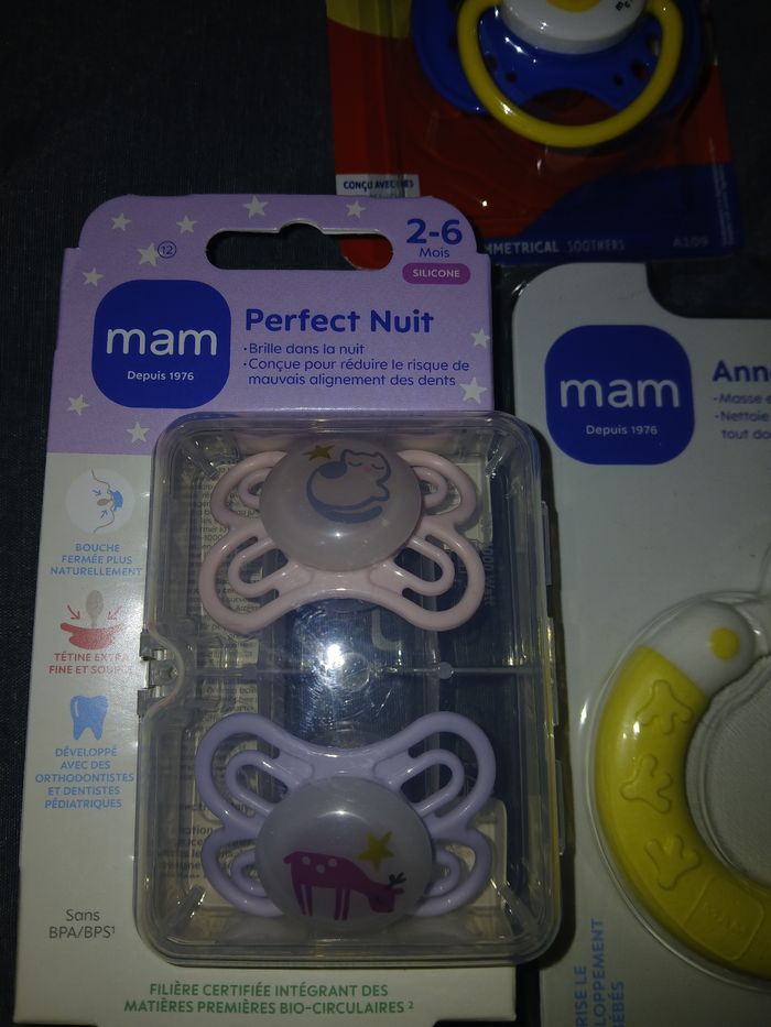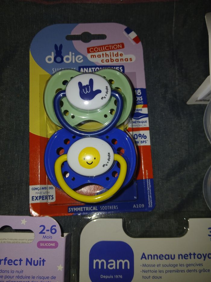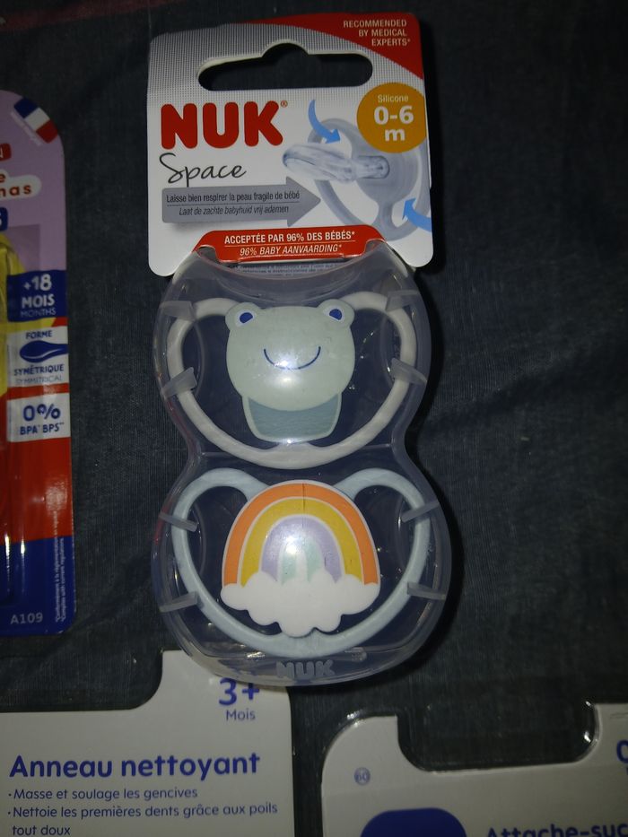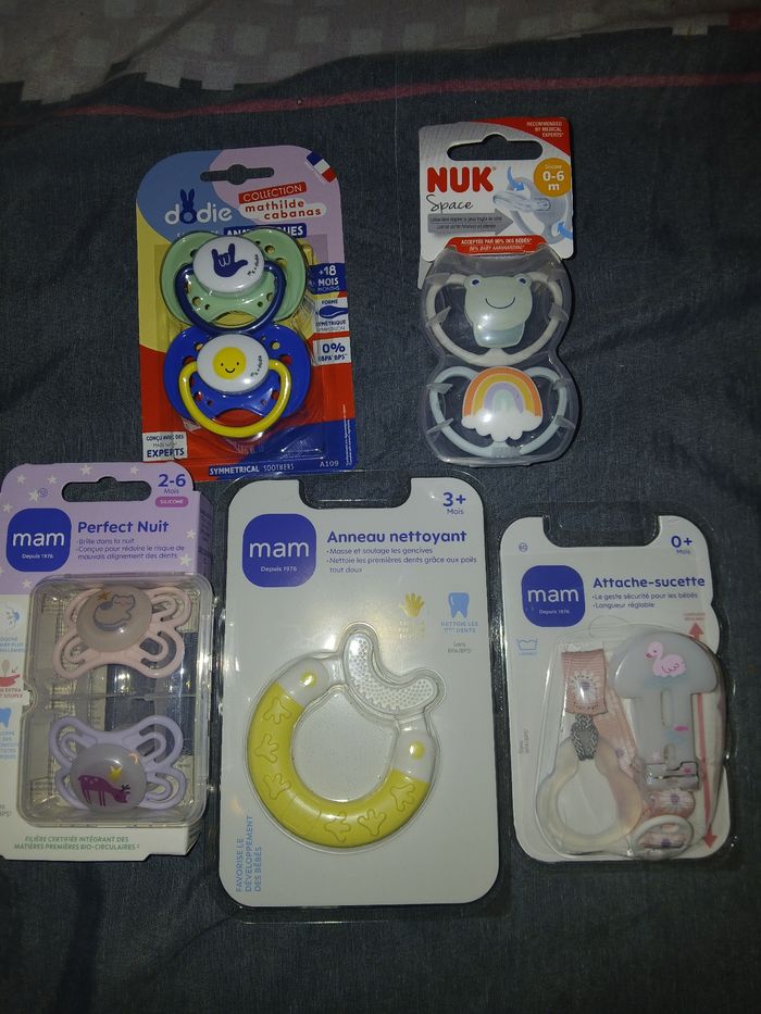 Vends lots de de 6 sucettes, un attache sucettes et un anneau nettoyant. Des marque mam,dodie et nuk Jamais servie N esite pas a regarder mes autres annonces concernant bébé et maman .