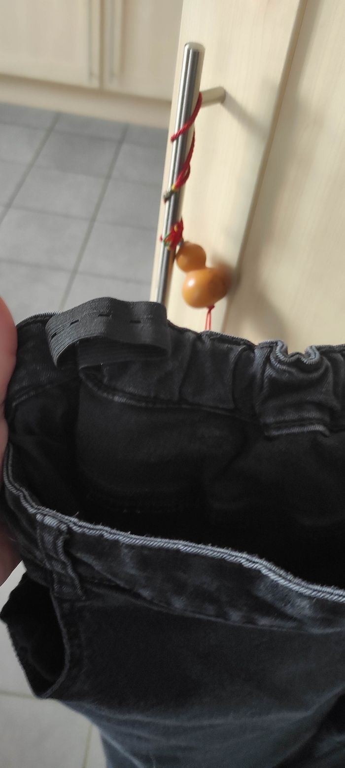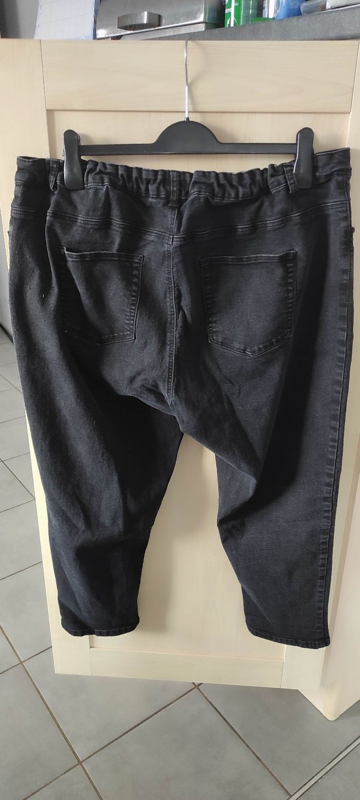 Jean noir avec élastique intérieur Fermeture boutons +zip Coton/elasthane/polyester Taille 57 cm max Hanches 64 cm Entrejambe 60cm En très bon état Gemo 54