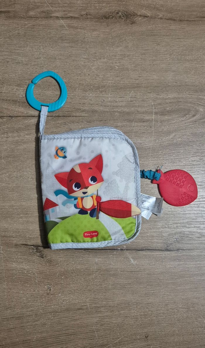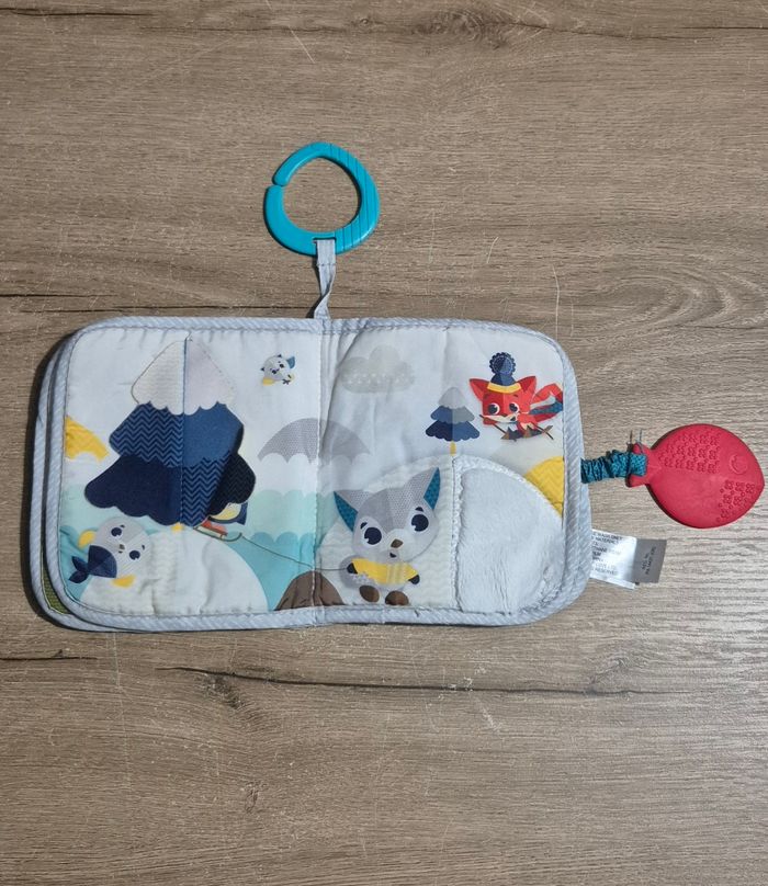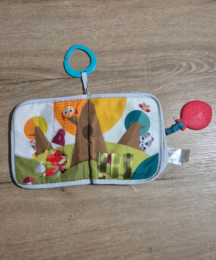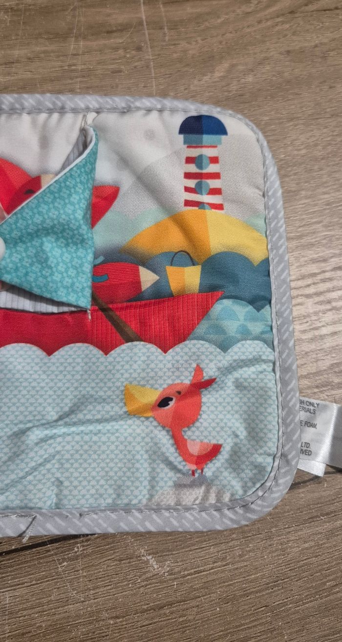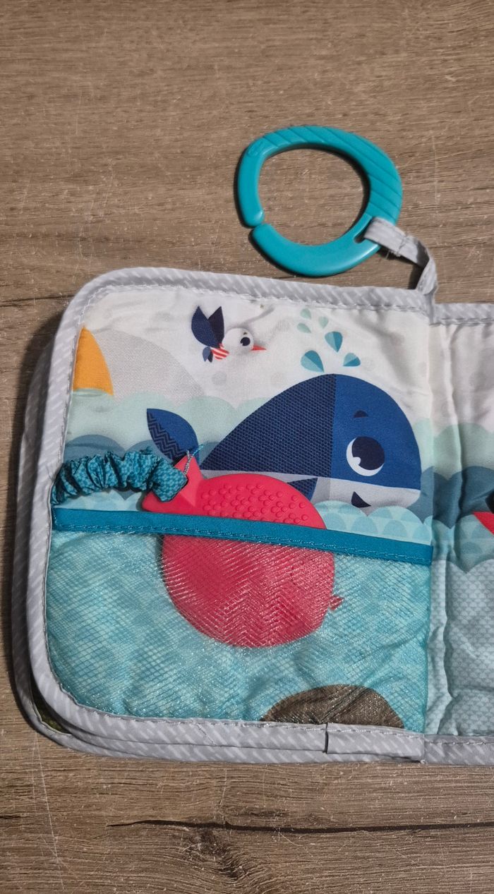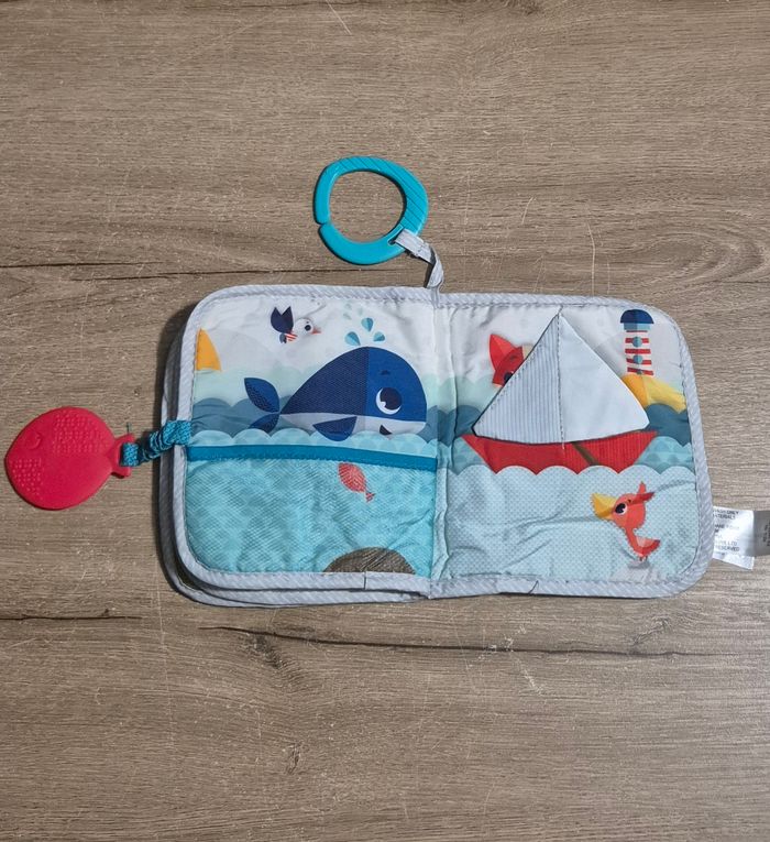 Livre d'éveil en tissus d'activités : différentes matières et textures à toucher, volets à soulever, étiquettes, poisson souple à ranger dans le filet servant d'anneau de dentition Tiny Love Très bon état