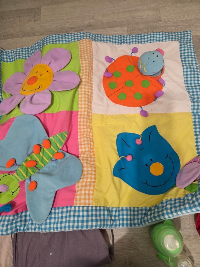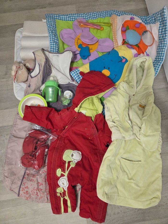 Vends lot comprenant - 1 tapis d éveil bon état, quelques petites tâches - 1 combipilote bien chaude petit 6 mois très bon état, jamais portée, avec moufles et chaussons pouvant être crochés - 1 combipilote un peu plus grande, plus légère, haut et bas dissociable, très bon état - 1 cale bébé état satisfaisant - 1 assiette ventouse - 1 tasse avec embouts progressifs AVENT - 3 cuillères bébé BEABA -1 paire de protèges sangles pour siège auto nounours très bon état, jamais servi - 1 anneau de dentition/peluche éléphant -1 gigoteuse état satisfaisant