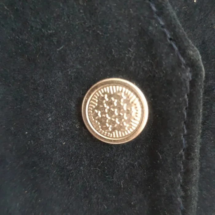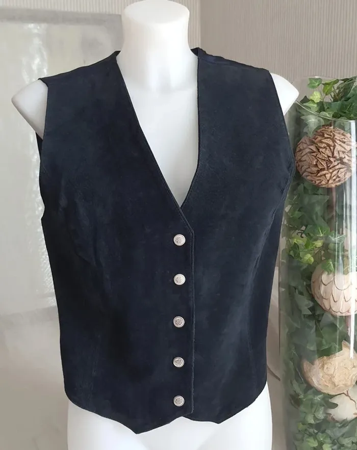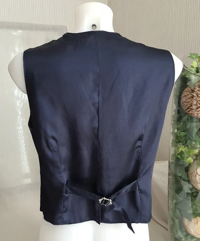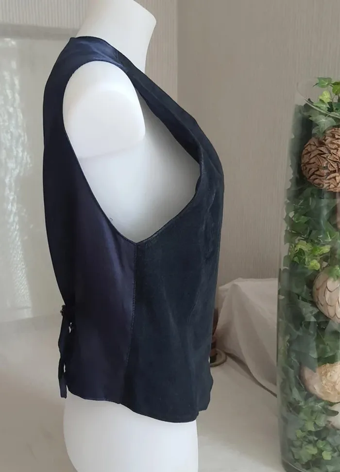 Gilet femme #Miss Dynam, taille M Cuir et Satin, martingale, boutons pressions Sans manche, bleu marine Dimensions à plat: sous aisselle 46 cm., hauteur 55 cm.