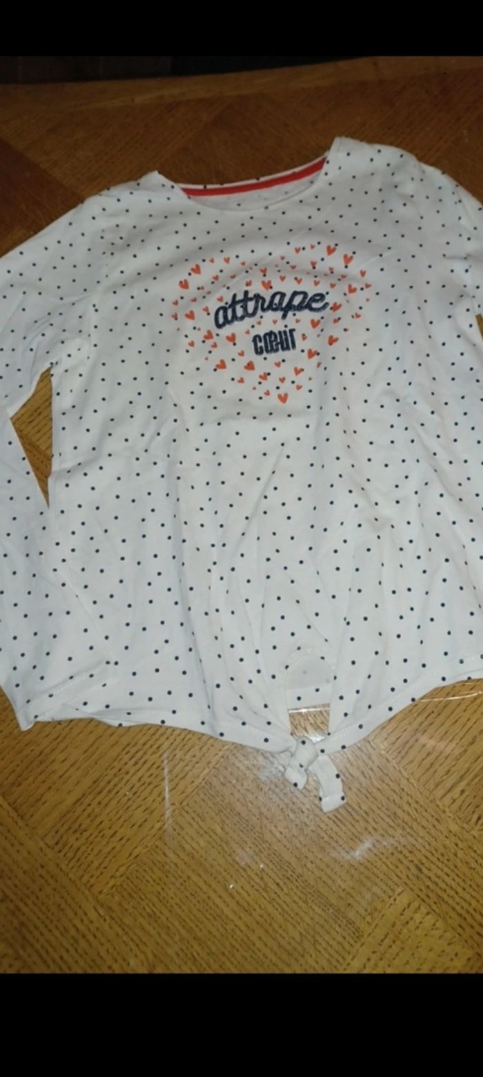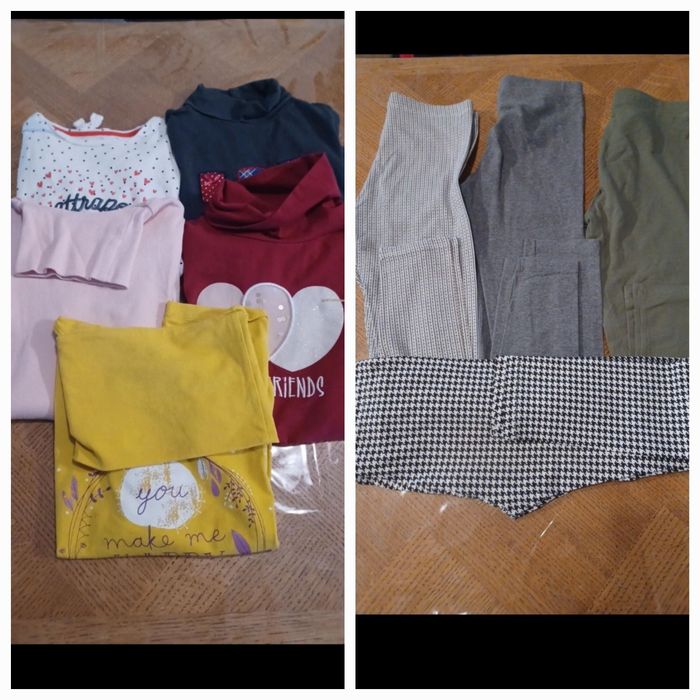 •2 tee-shirts manches longues et col montant un moutarde et un bordeau 10 ans très bon état Vertbaudet •1 tee shirt manches longues blanc à pois très bon état Vertbaudet •1 rose pâle neuf col montant Gémo •1 gris col montant pressions à l'arrière Sergent Major 5 leggins longs taille élastique - 1 kaki neuf U - 1 gris Kiabi tbe - 1 noir et blanc Kiabi neuf - 1 blanc motif moutarde et marine kiabi tbe - 1 rouge (que je donne pas sur les photos) Orchestra tbe sauf petit trou refait voir photo