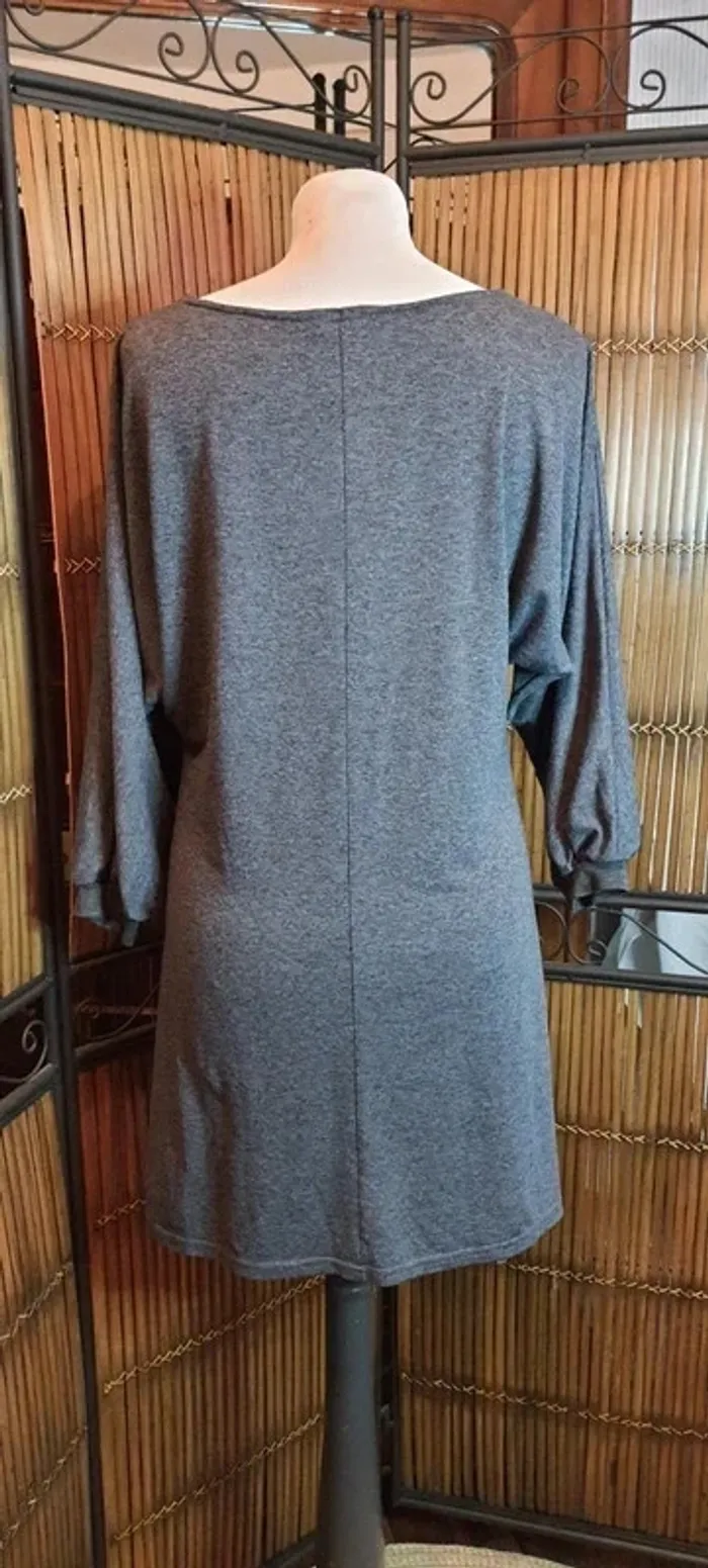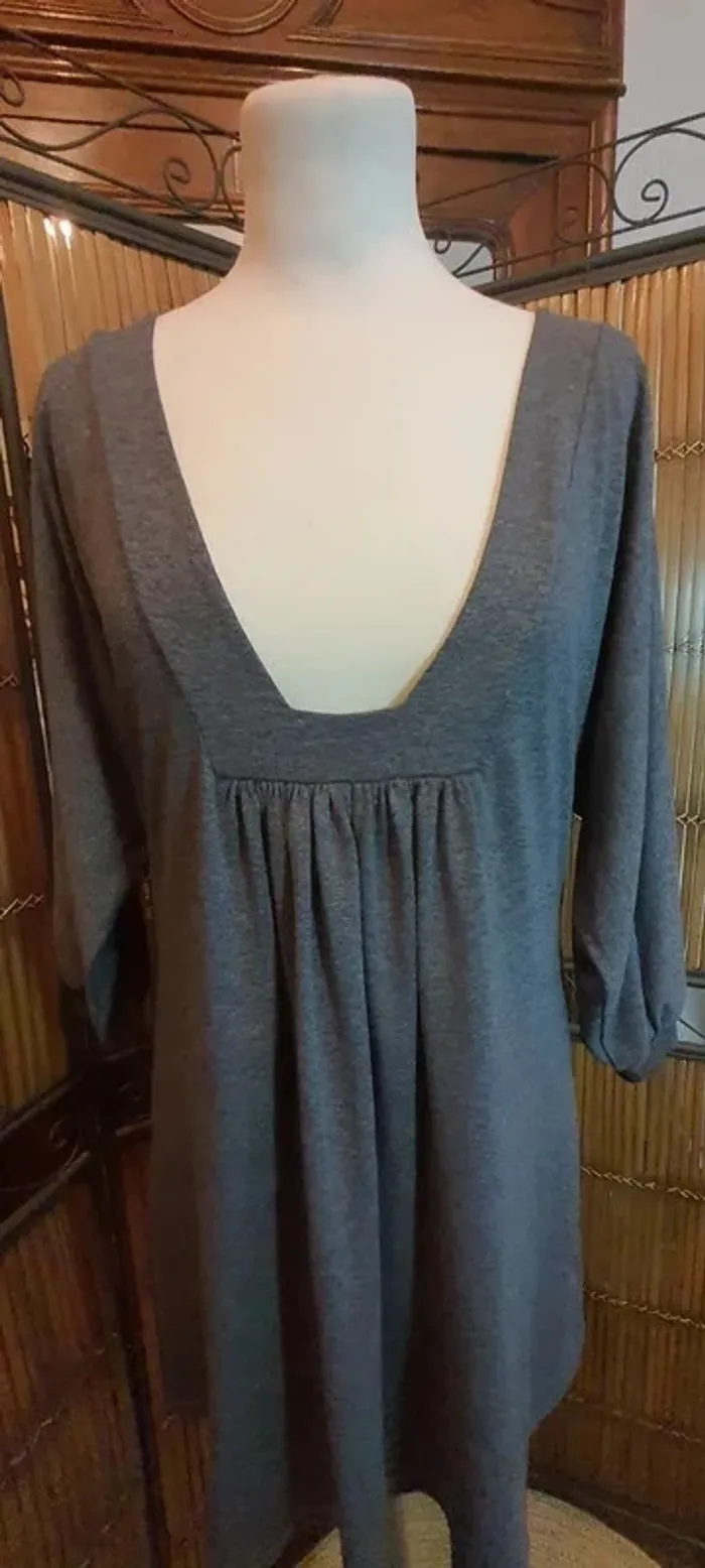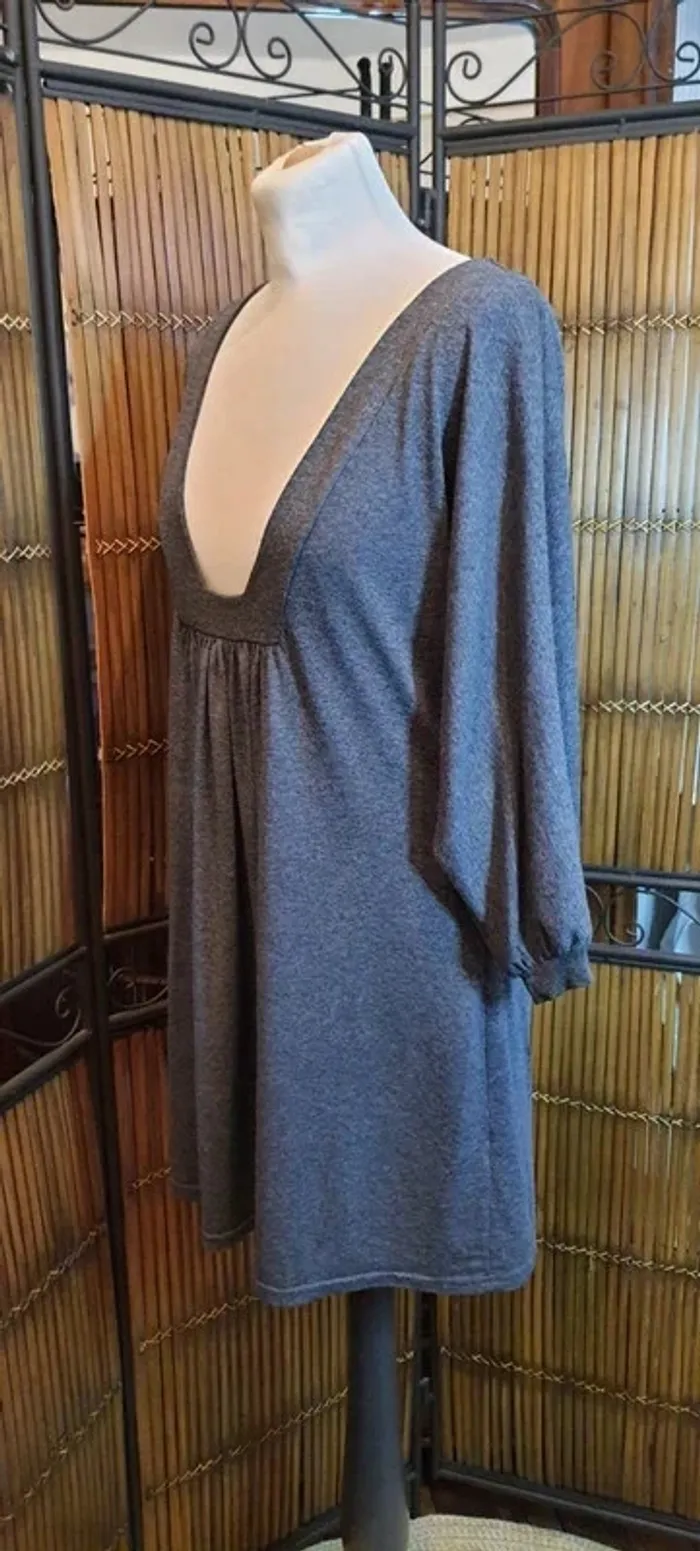 Robe mini grise, taille L Marque #FULL ZATARA, fabriqué en France 92% viscose, 8% élasthanne Dimensions à plat: épaule 46 cm. , sous aisselle 52 cm., hauteur 82 cm.