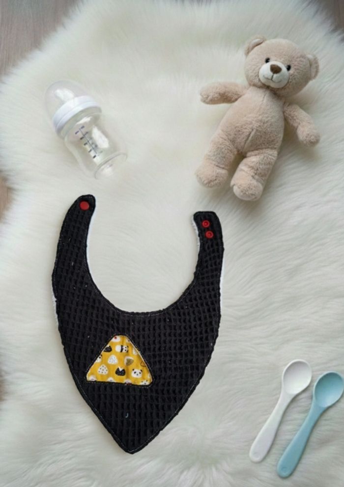Bavoir bandana fait main, doux et absorbant. Idéal pour la dentition et le quotidien Taille: 9 mois à 18 mois Dimensions approximatif: ▪️Largeur total: 21 cm ▪️Hauteur total: 30 cm ▪️Ouverture du cou largeur 15 cm et profondeur 14 cm ✔️ Bavoir en nid d'abeille + éponge bambou Entretien: ▫️ Lavage en machine 30°C ▫️Séchage à l'air libre recommandé ▫️Pas de repassage sur l'éponge bambou Le bavoir bandana est fabriqué avec du tissus Oeko-Tex. Bouton pression réglable(2 pressions). Bavoirs unique