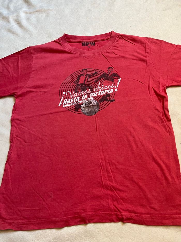 vends ce T-shirt manches courtes de couleur rouge Motifs footballeur Espagne écriture Vamos Chicos hasta la victoria Campeone desde 1982 taille 12 ans demie largeur aux aisselles 44 cm longueur 55 cm 2 euros Mes autres annonces de vêtements pour garçons de 10 à 12 ans #lma42garcon10 #lma42garcon11 #lma42garcon12