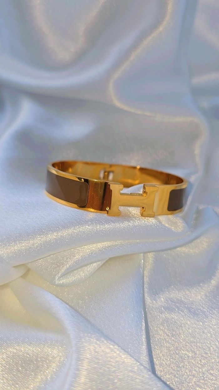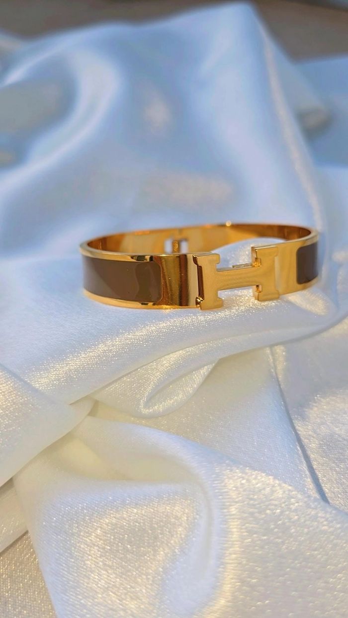Élégant bracelet jonc en métal doré et émail beige. Ce modèle intemporel se distingue par son fermoir central en forme de lettre et sa finition lisse et brillante. Un accessoire chic et minimaliste, idéal pour être porté seul ou en accumulation