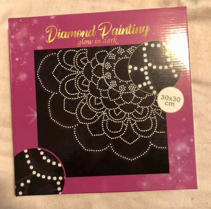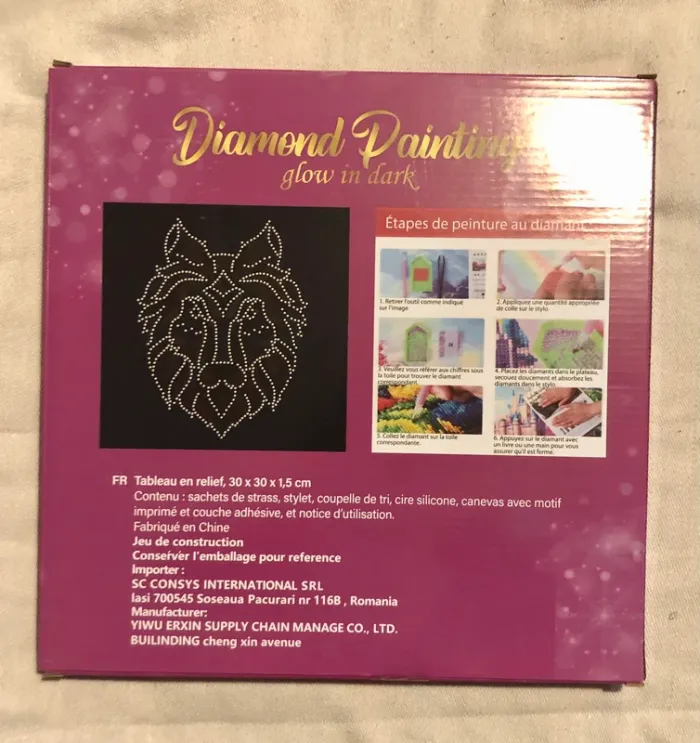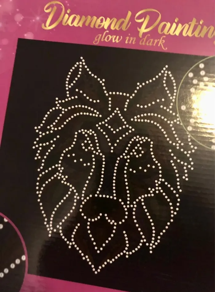 Lot de deux kits Diamond Painting phosphorescents Tableaux en relief 30 x 30 x 1.5 cm Contenu par kit : Sachets de strass, stylet, coupelle de tri, cire silicone, canevas avec motif imprimé et couche adhésive adhésive et notice d'utilisation Motifs Mandala et loup Neuf