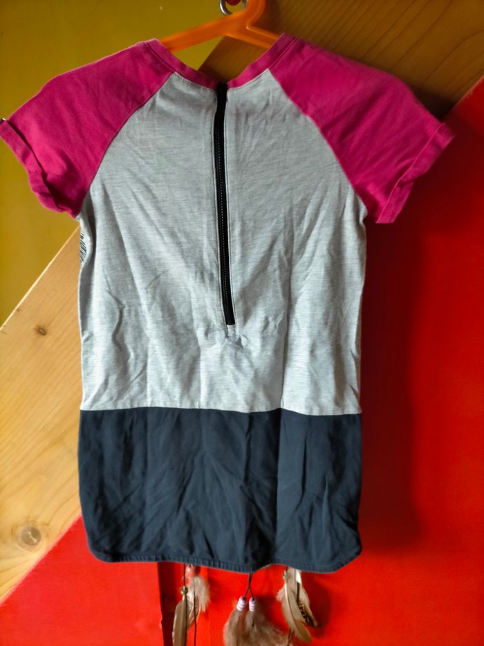 BE Porté mais pas de défaut. Jolie robe à manches courtes en jersey de gris gris, noir et fuchsia à motif de fleurs. Petit cœur griffé catimini et zip au dos