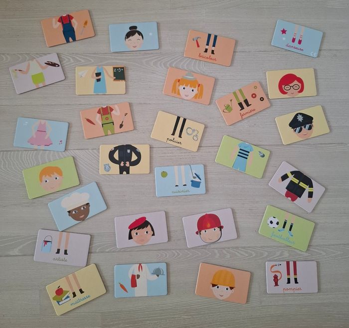 Jeu de cartes éducatives métiers et chiffres complet Comprend 27 cartes recto-verso : un côté métier et un côté chiffres Parfait pour développer le langage, l’esprit d’analyse, l’apprentissage des chiffres et des métiers