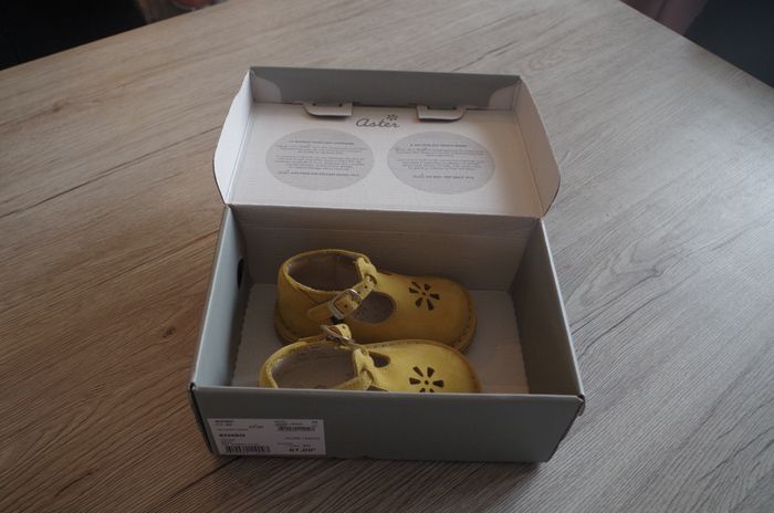 À vendre, une magnifique paire de chaussures pour bébé de la célèbre marque française Aster, modèle emblématique "Bimbo". Ces chaussures sont en très bon état, car portées avec grand soin. Elles sont idéales pour accompagner les premiers pas de votre enfant grâce à leur maintien parfait et leur qualité de fabrication. Pointure : 20 Couleur : Jaune Lemon (un beau jaune doux et frais) Matière : Cuir de haute qualité (extérieur et intérieur) Détails : * Fermeture par boucle pour un ajustement optimal. Petite fleur découpée sur le dessus pour un style adorable et aéré. Semelle robuste et souple, parfaite pour l'apprentissage de la marche. Vendues avec leur boîte d'origine. Prix d'origine : 67,00 €