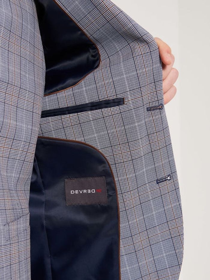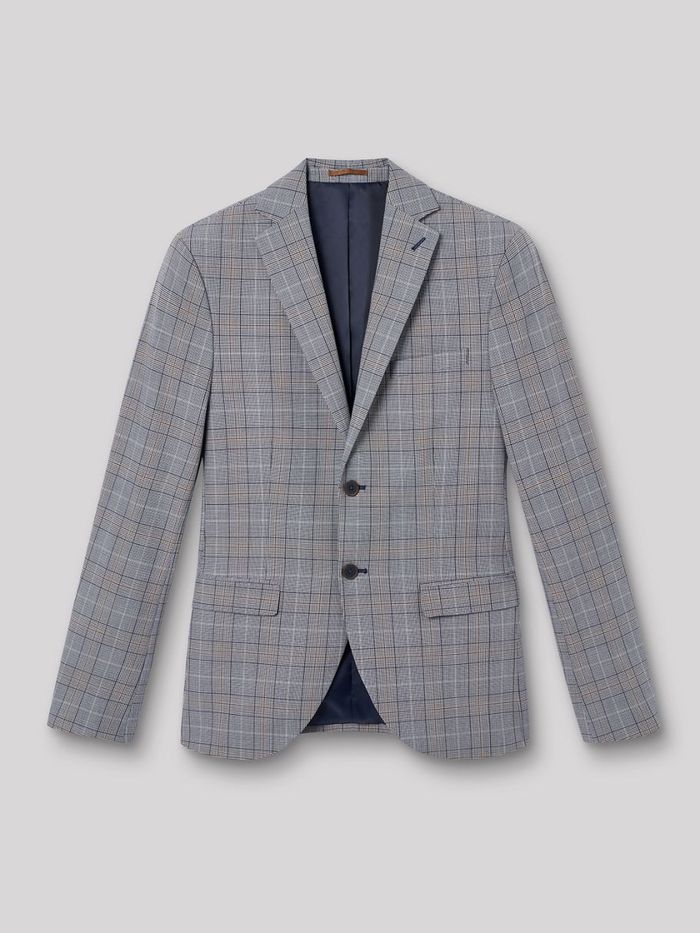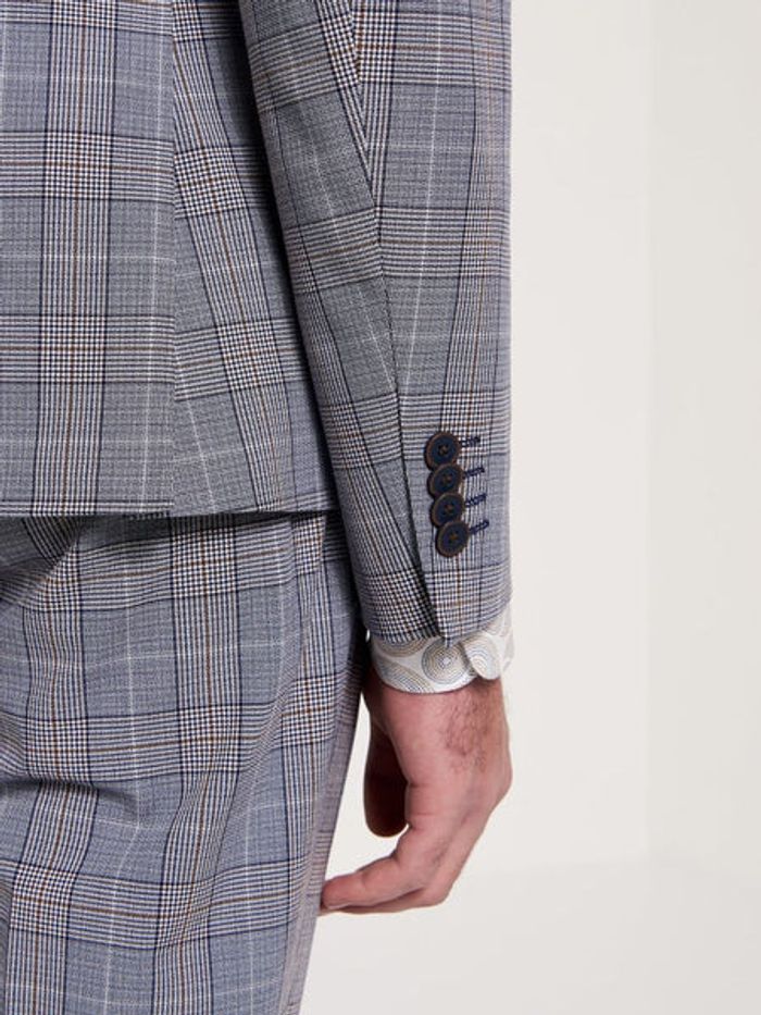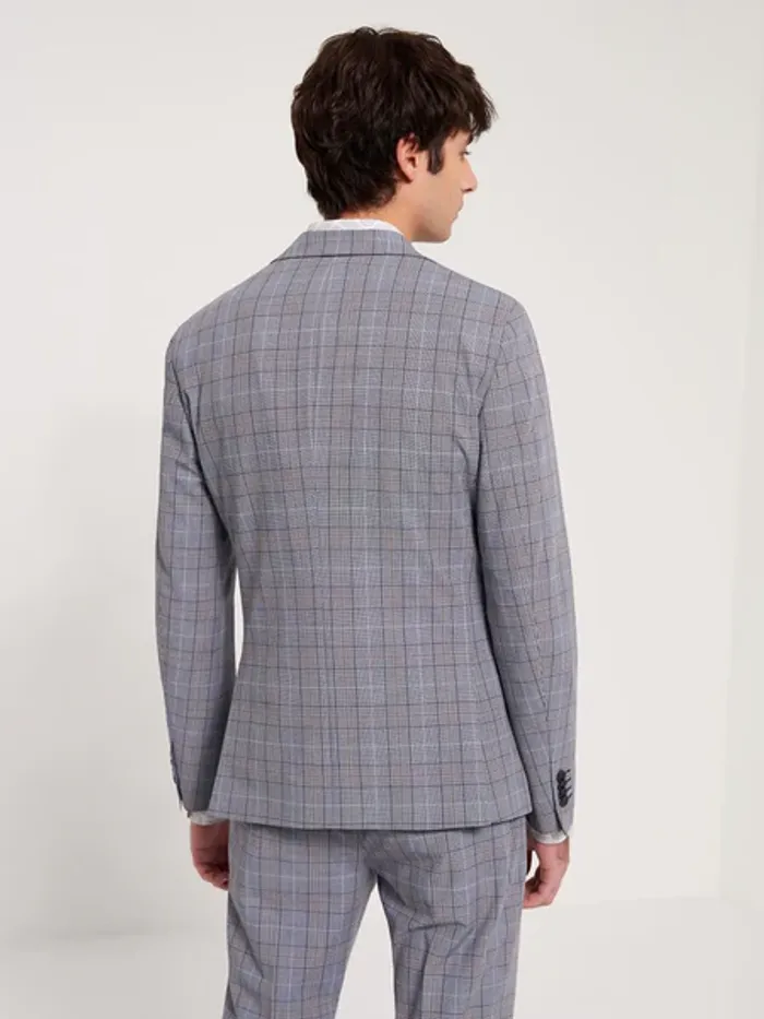 Confectionné en poly-viscose. Coupe Extra slim : coupe étroite et près du corps. Tissage Twill : Tissage reconnaissable à son dessin en diagonal. Motif : Prince de Galles. Fermeture avant à 2 boutons. Col crans ouverts. Poche poitrine passepoilée. 2 poches devant à passepoils et rabats. Poignets avec 4 boutons. 2 fentes au dos. Veste doublée. 2 poches intérieures. Rembourrage épaule allègé. Bi-stretch. Le bi-stretch est un tissu en chaine et trame légèrement extensible dans les 2 sens. 64 % POLYESTER 30 % VISCOSE 6 % ÉLASTHANNE