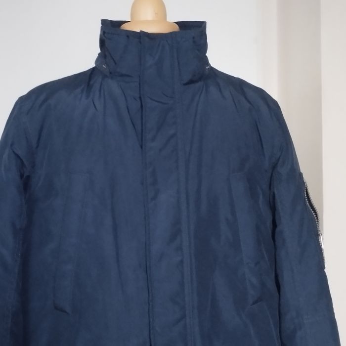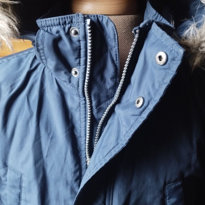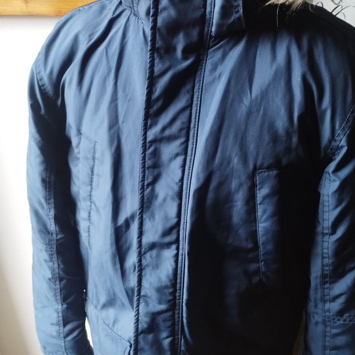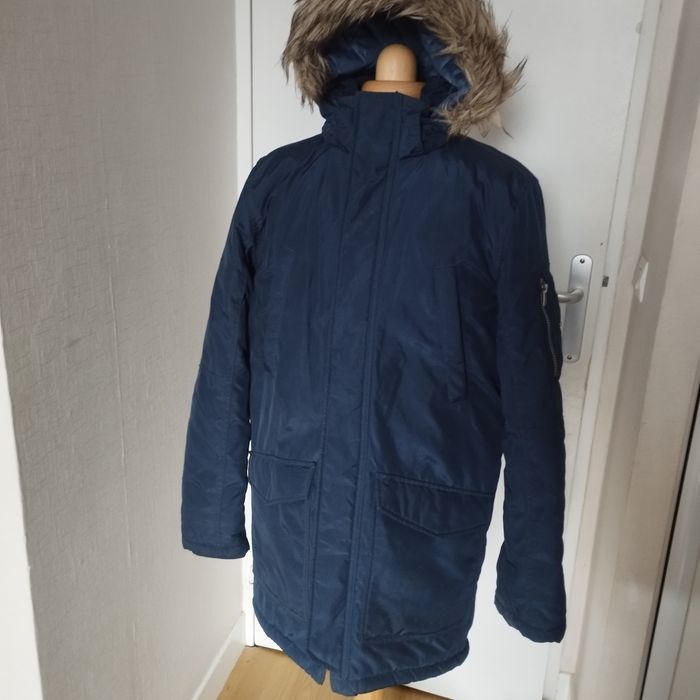 Parka à capuche pour garçon 13/14ans, 2 grandes poches avant et 2 au niveau de la poitrine, double fermeture une par fermeture éclair et une autre par boutons pressions, peut se porter sans la capuche qui est démontable. Couleur bleu marine