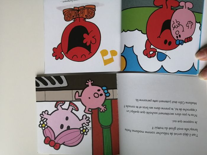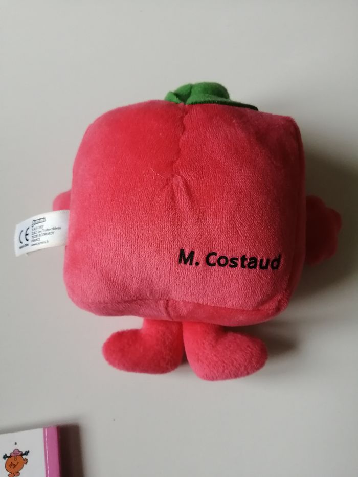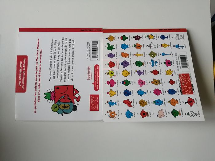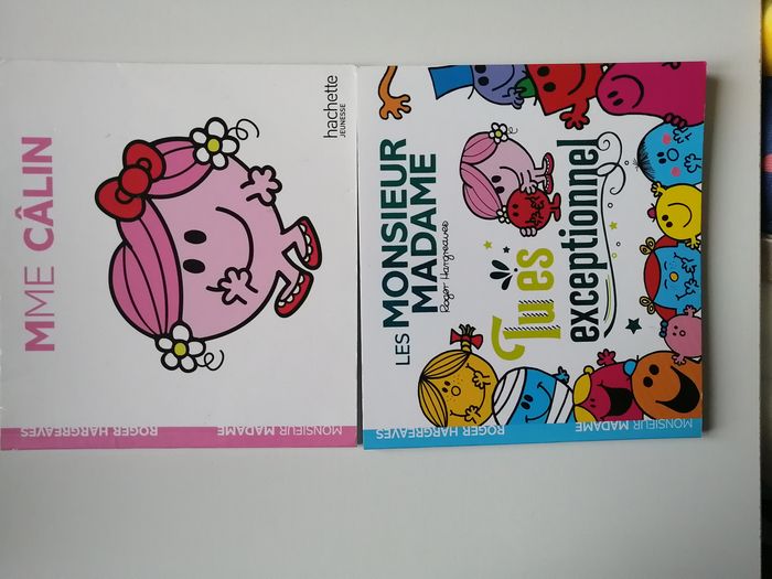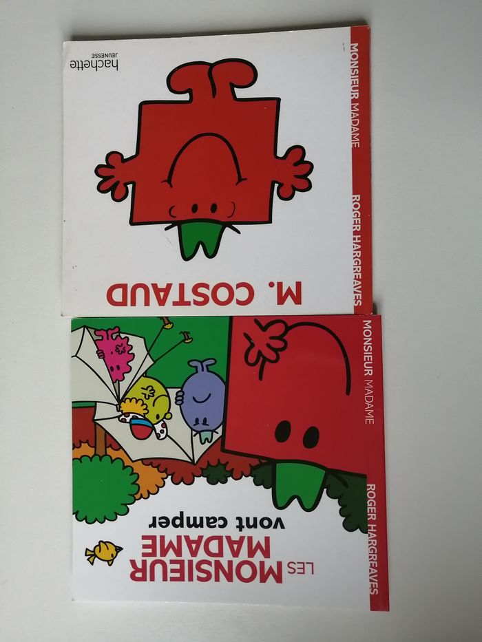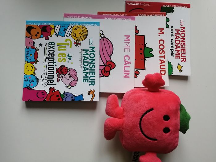 lot thème monsieur madame composé de 1 peluche M. costaud jemini 14 cm + 4 petits livres souples hachette jeunesse M. costaud ISBN 9782012245525 MME câlin ISBN 9782012206007 les monsieur madame vont camper ISBN 9782013987486 les monsieur madame tu es exceptionnel ISBN 9782012102132 à noter empreintes sur la page où l'enfant doit laisser les siennes d'origine ou non je ne sais pas - voir photo