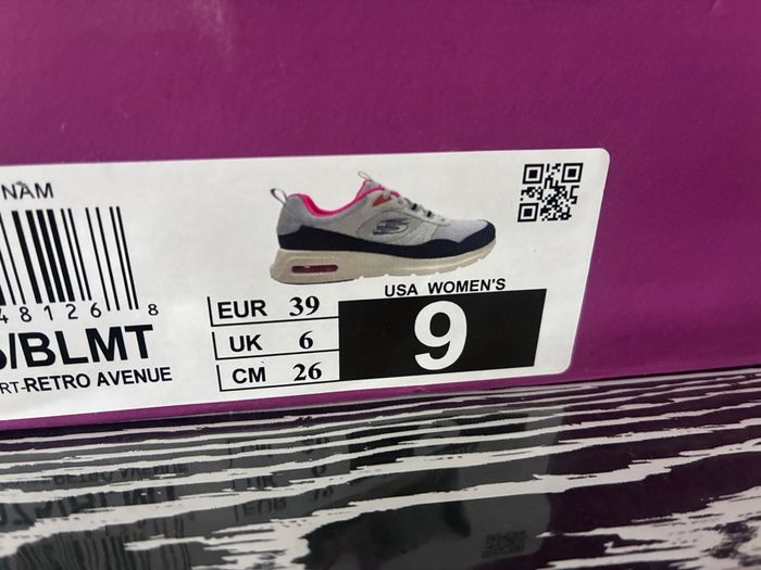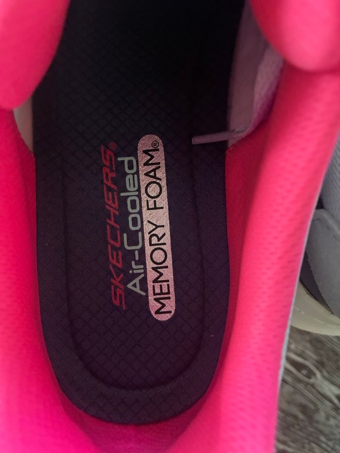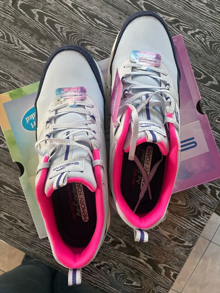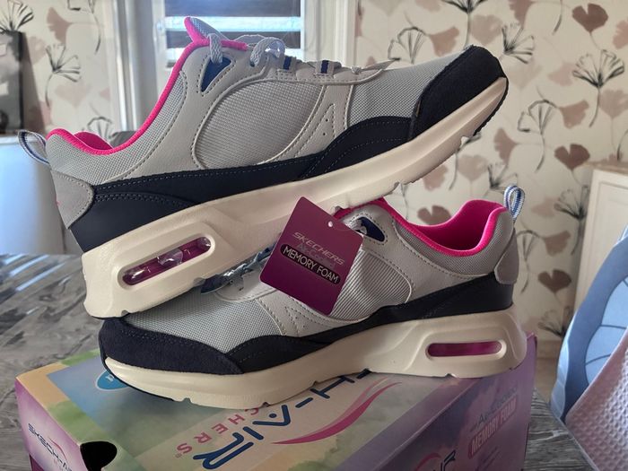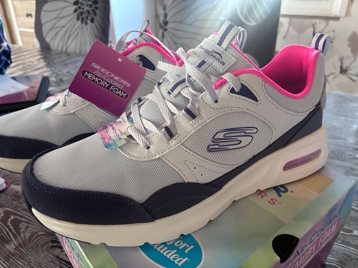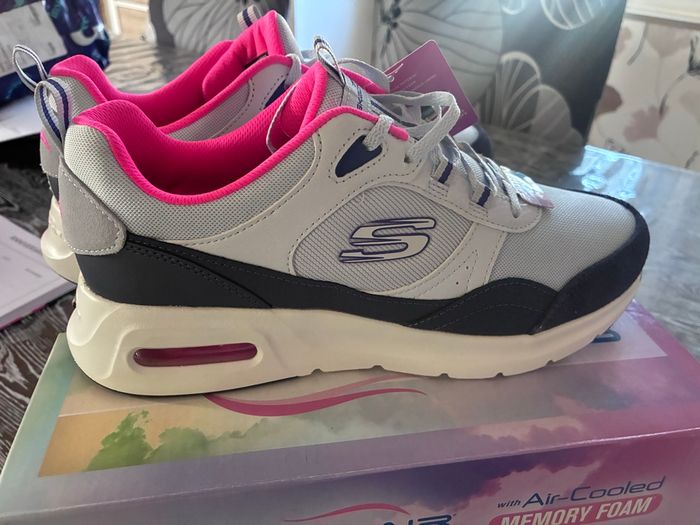 Une paire de baskets skechers bleu claire, bleu marine, rose Bulle d’air au talon Neuf dans son emballage Pointure 39