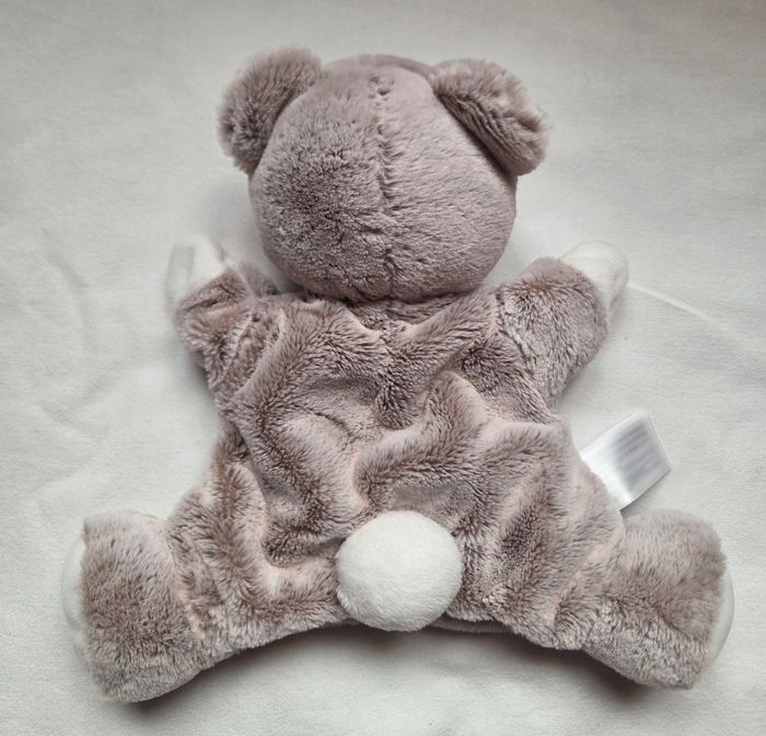 Doudou marionnette ours en velours chiné de couleur gris marron. Cercle sur le ventre , intérieur des oreilles , bout des pattes et queue en pompon, en velours de couleur blanc.