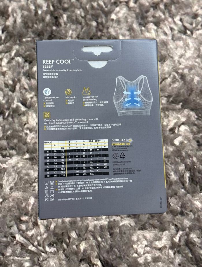 Soutien-gorge maternité et allaitement neuf, jamais porté, encore dans son emballage d’origine. ✨ Détails : • Modèle : Keep Cool Sleep • Ultra respirant (zones de ventilation) • Sans armatures • Maintien doux et confortable • Parfait pour le sommeil, la détente et l’allaitement nocturne • Matière extensible qui s’adapte aux variations de la poitrine 📏 Taille : XL 🎨 Coloris : noir Idéal pendant la grossesse et après l’accouchement.