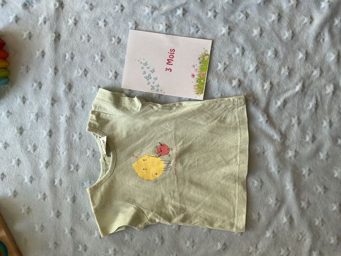 teeshirt manches courtes vert menthe dessin devant 3 mois tape à l'oeil ouverture totale au dos