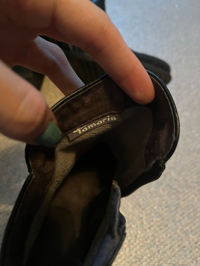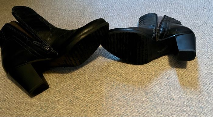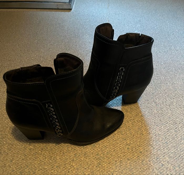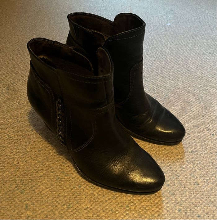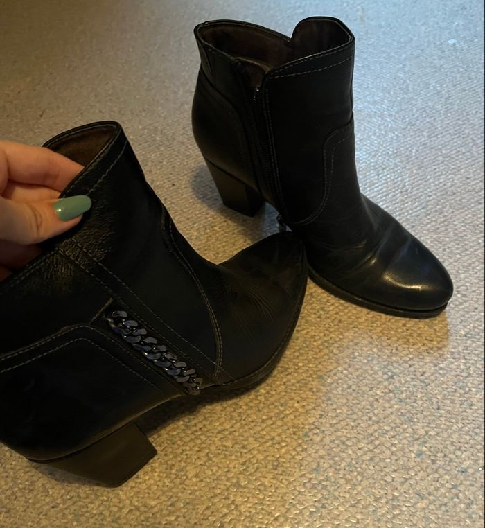 Jolie bottines noire à talon 7cm - cuir véritable. Marque Tamaris. Chaînette sur le côté. Très peu mise, aucun défaut. Achetée en magasin à presque 300€. Pleins d’autres articles dans mon dressing n’hésitez pas à faire un lot.