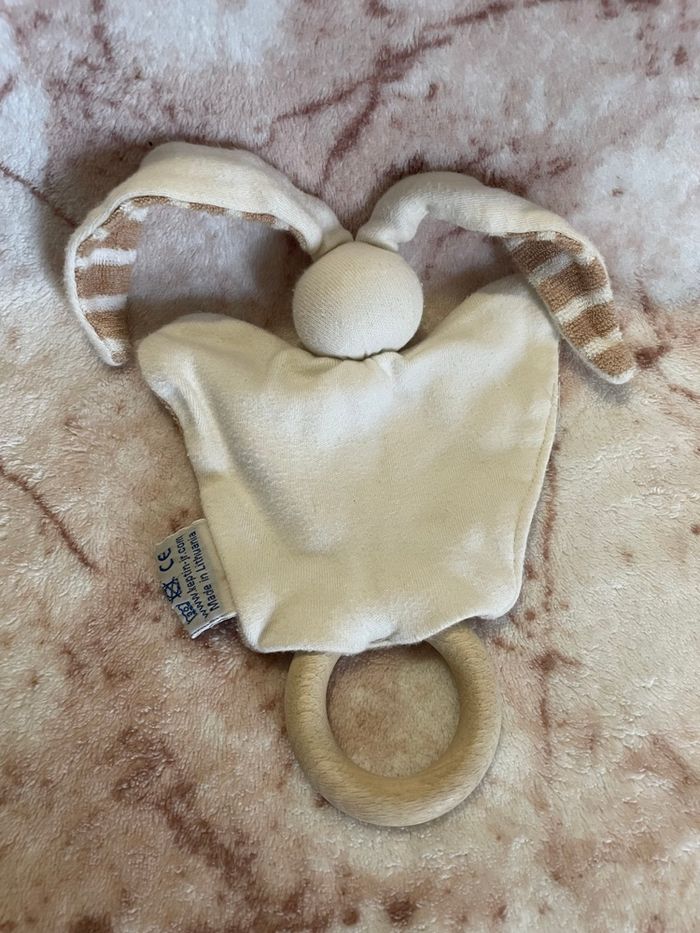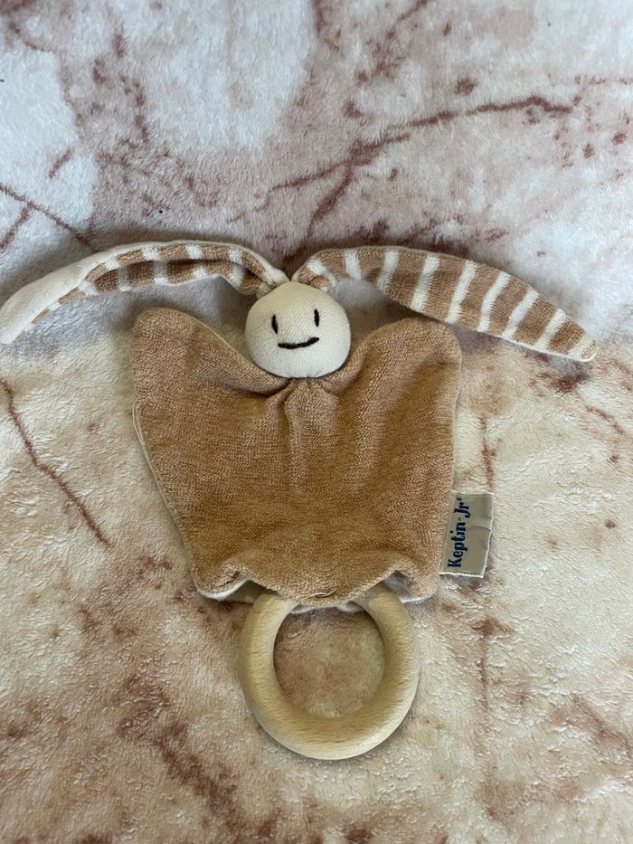 Doudou plat lapin marron et beige Oreiller rayé Anneau en bois Keptin-Jr Occasion en bon état Vous achetez le doudou que vous voyez sur la photo