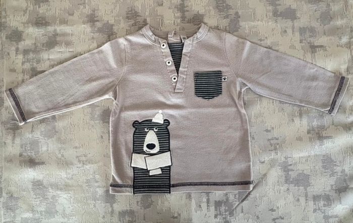 Pull fin manches longues – 12 mois – Gris motif ours 🐻 – 60% coton / 40% polyester – TBE  - photo numéro 1