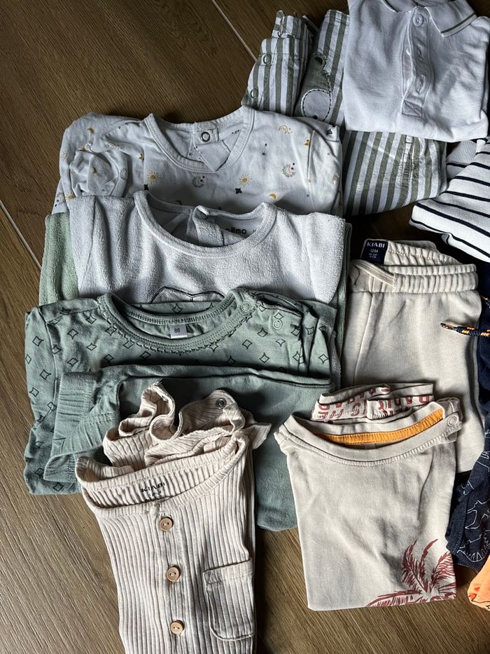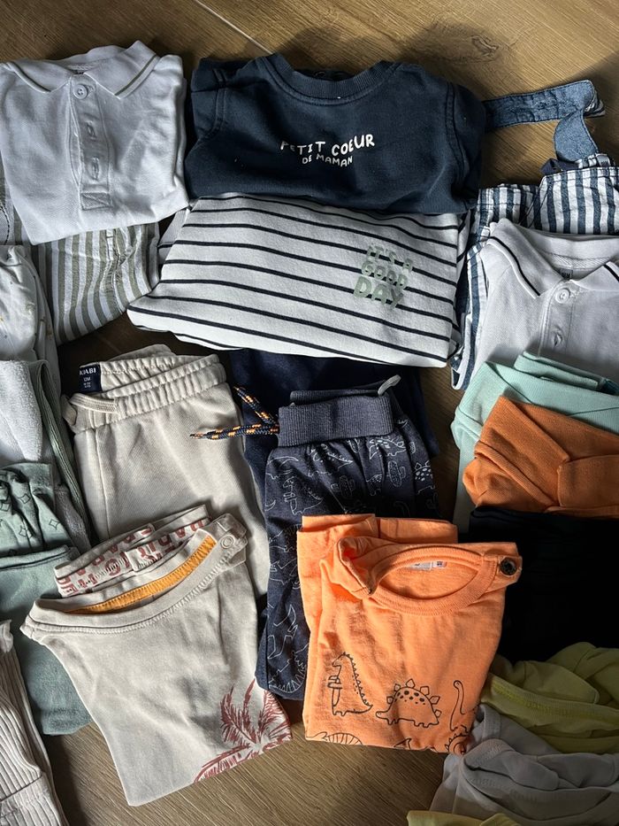 Vendu au carton, pas de détail Nombreux vêtements pour garçons taille 18 mois : bas de jogging, bodies manches courtes et sans manches, t-shirts manches courtes et polos, pyjamas, 1 ensemble avec short, 2 sweats, 2 combinaisons d’été avec polos Certains articles ont été très peu portés Différentes marques