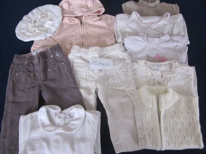 12m, 2 pantalons + 4 hauts ml + veste à capuche + gilet + chapeau + haut ml offert, kiabi, kimbaloo ...
