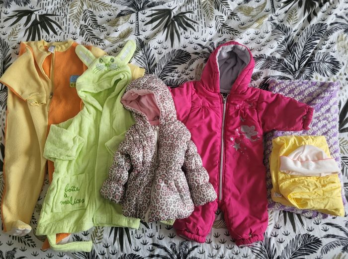 1 peignoir 12 mois, 1 combinaison 6/9 mois, 1 manteau 12 mois, 1 pyjama 24 mois, 1 drap housse, 1 couverture, 1 bonnet.