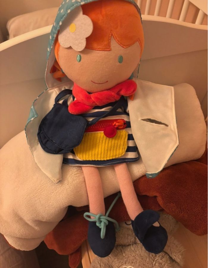 Avec Lisette la poupée d'activités, votre enfant apprend à son rythme à boutonner une veste, nouer des lacets, une écharpe et fermer une fermeture éclair. Ses sens sont mis en éveil grâce aux longues jambes de Lisette, ses jolis tissus colorés, sa fleur en feutrine à scratcher sur ses cheveux. Mais Lisette est aussi un doudou et une première poupée en tissu à manipuler et câliner sans modération
