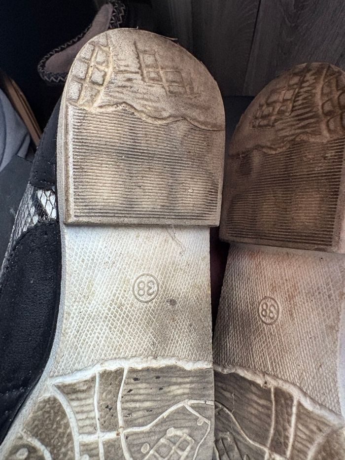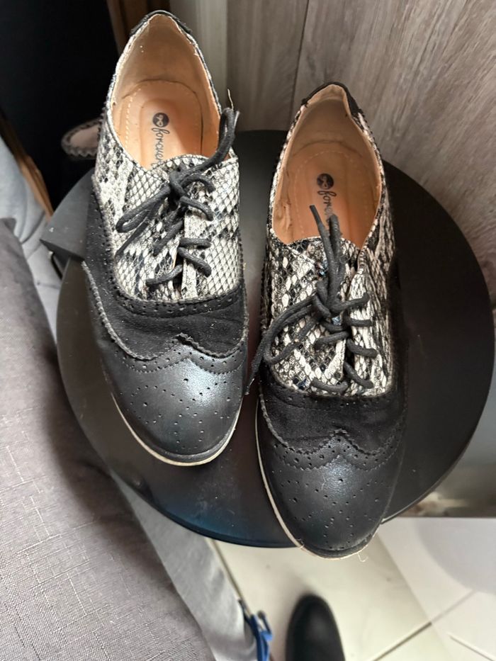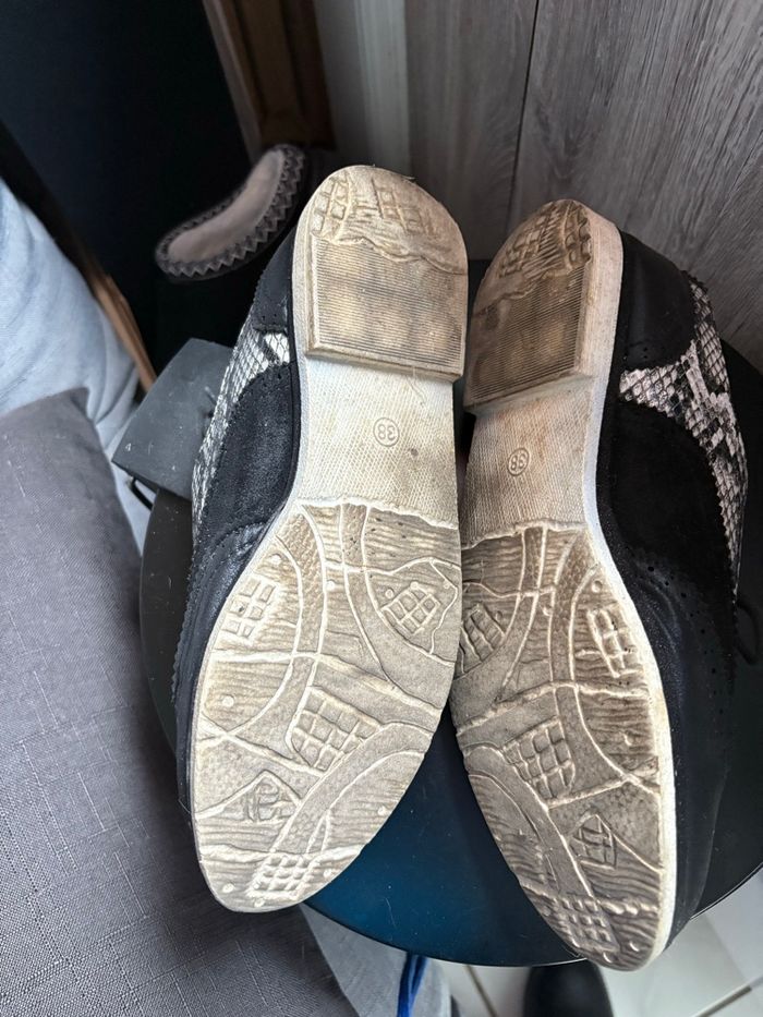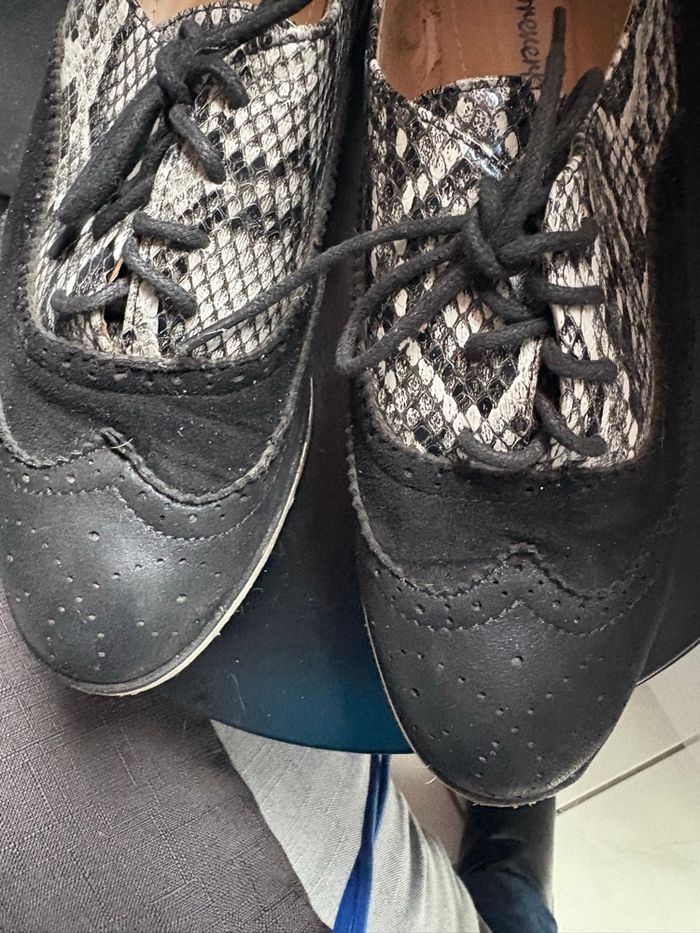 Mocassins à lacets noirs à motifs blancs et noirs Bon état Pointure 38 Pas très souvent porté Le+ le mélange de matière alliant cuir et tissu et son mélange de couleurs blanc et noirs À se procurer sans hésitation Petit prix Prix 5,00e