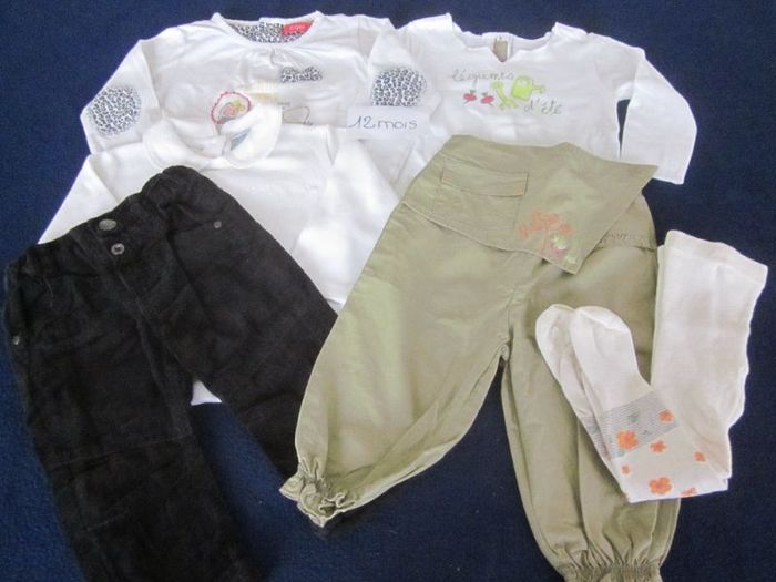 12m, 3 hauts ml + 2 pantalons + paire de collants