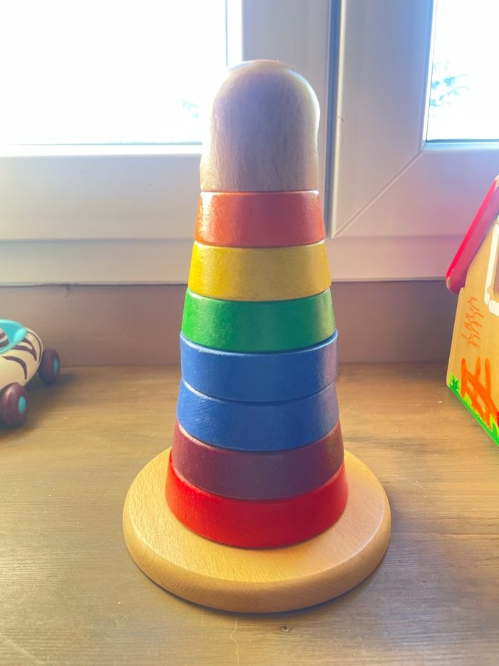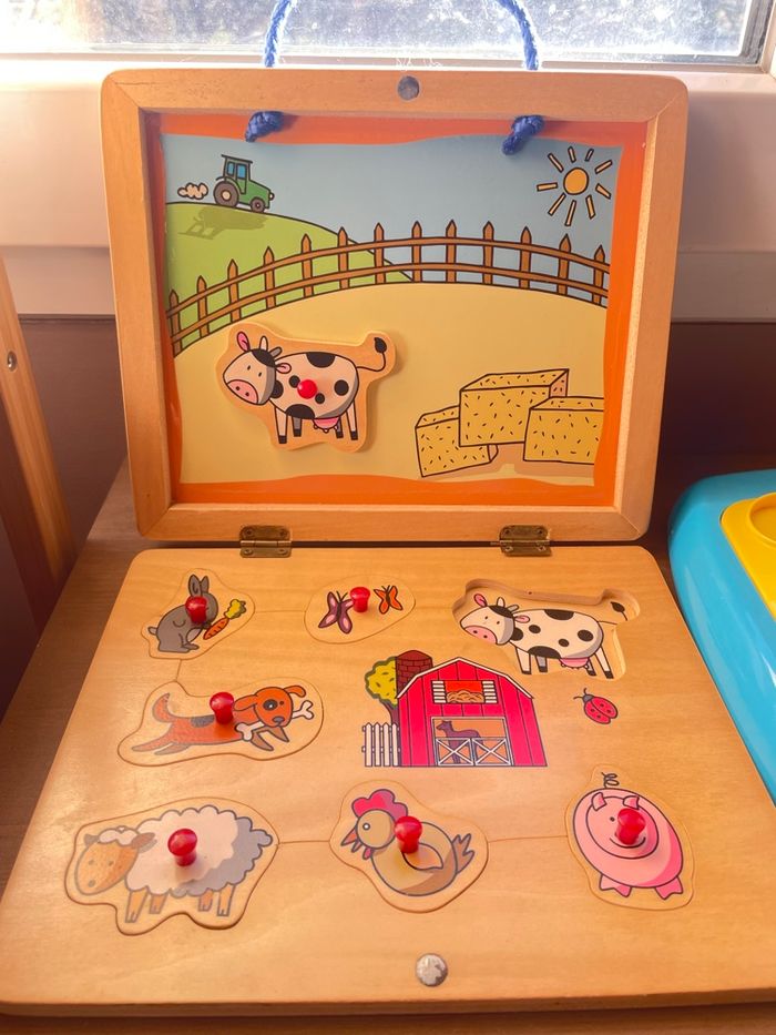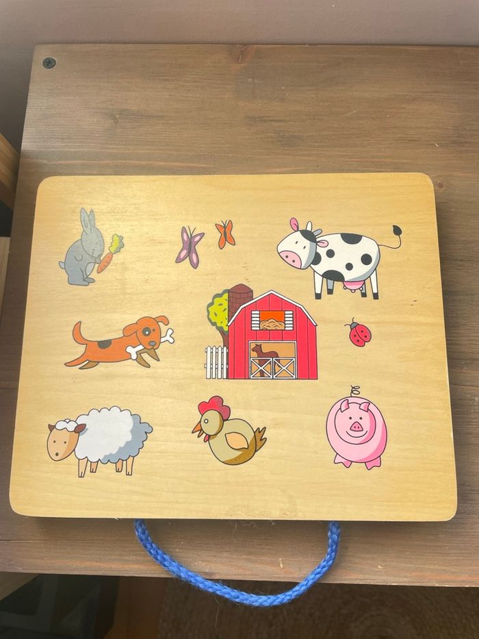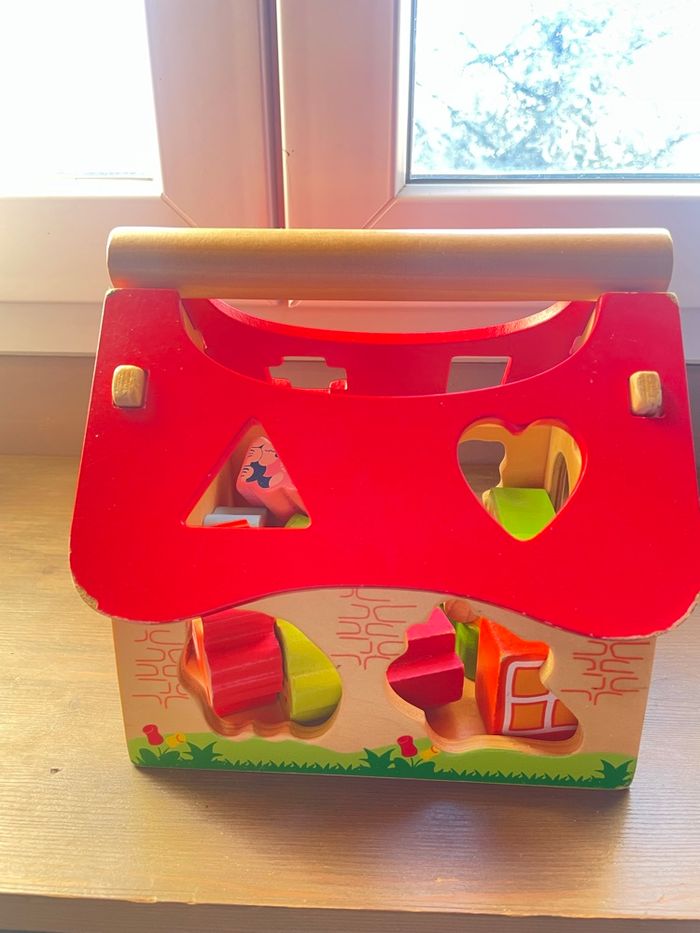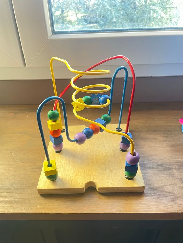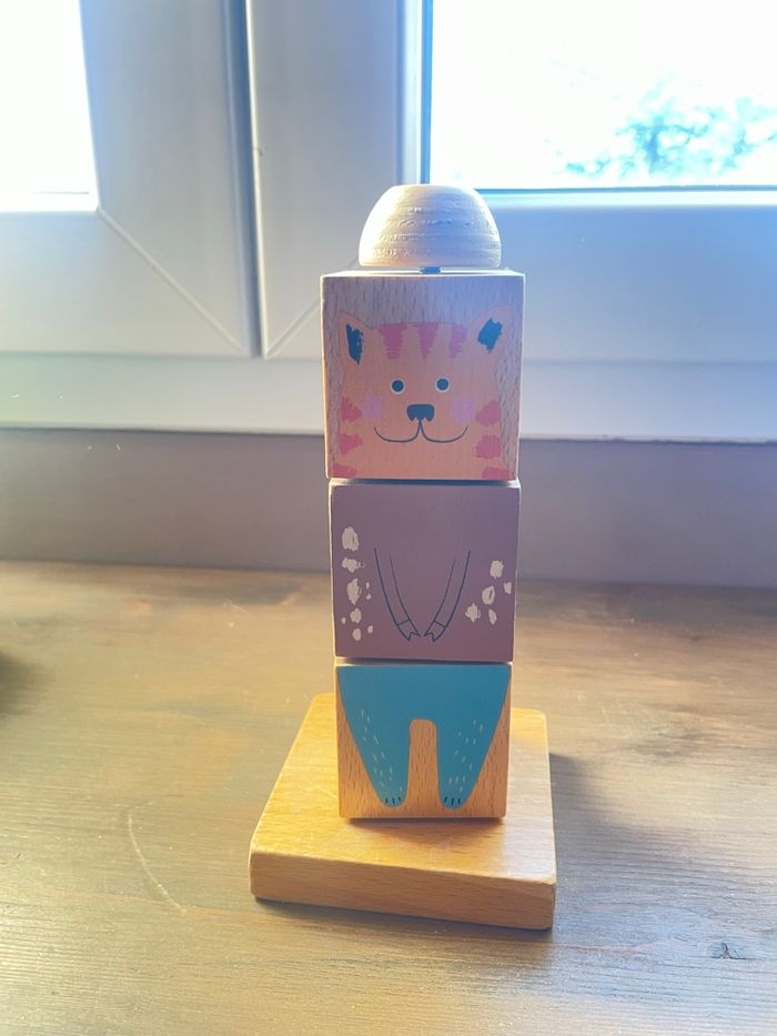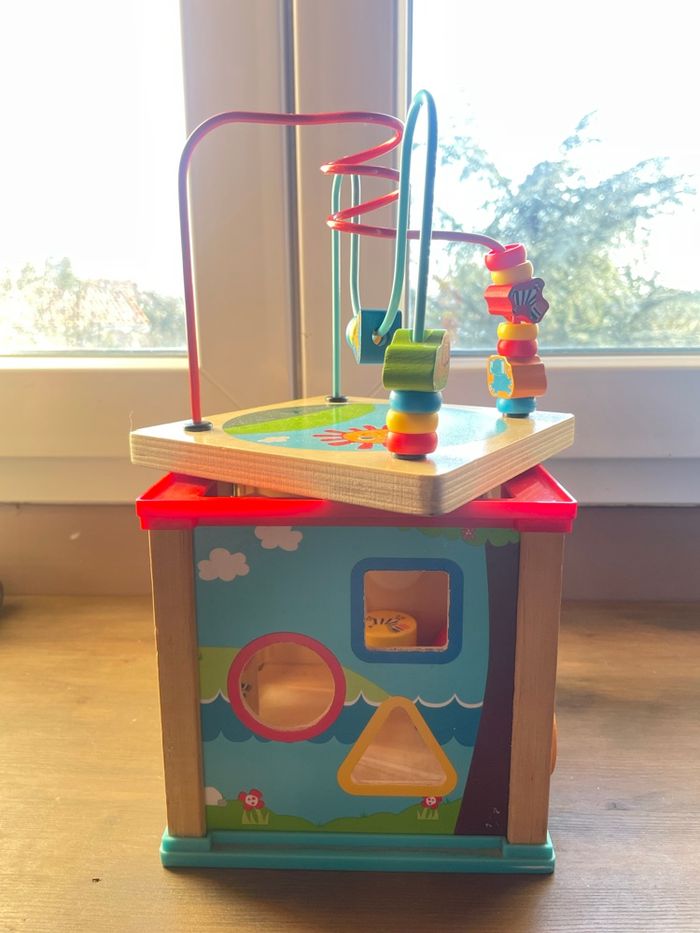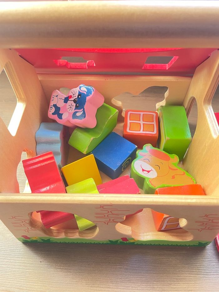 Lot de jouets en bois : 3 cubes qui tournent et forment un animal (djeco made in France), un jouet d’activités multiples complet et en bon état juste un éclat sur le bois où il y a les perles sur les formes en fer, une tour de couleur à empiler, une petite maison transportable avec ses formes complète mais peinture écaillée à certains endroits et sur les formes, et une petite mallette de transport avec les formes animaux qui peuvent s’aimanter sur le paysage en bon état un éclat en dessous, et un jeu de perles à déplacer