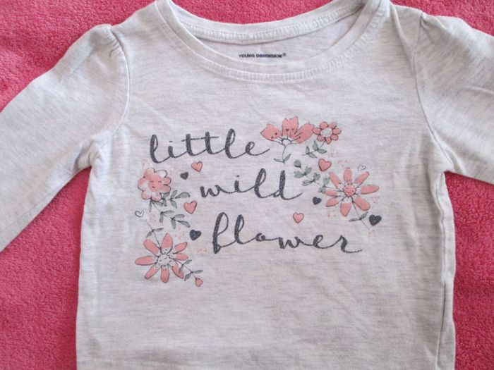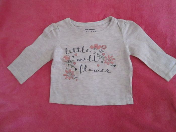 Vends tee-shirt Baby Girl. Manches longues. Motif fleuri sur le devant. 99 % coton + 1 % viscose. Taille 9 mois. Très bon état. Pour plus de choix, allez consulter mes autres annonces.