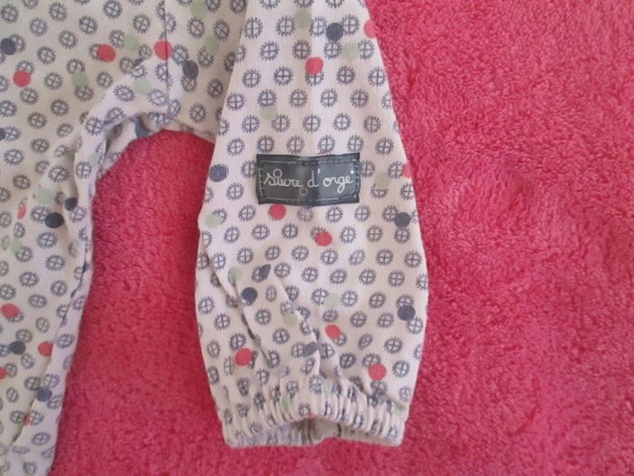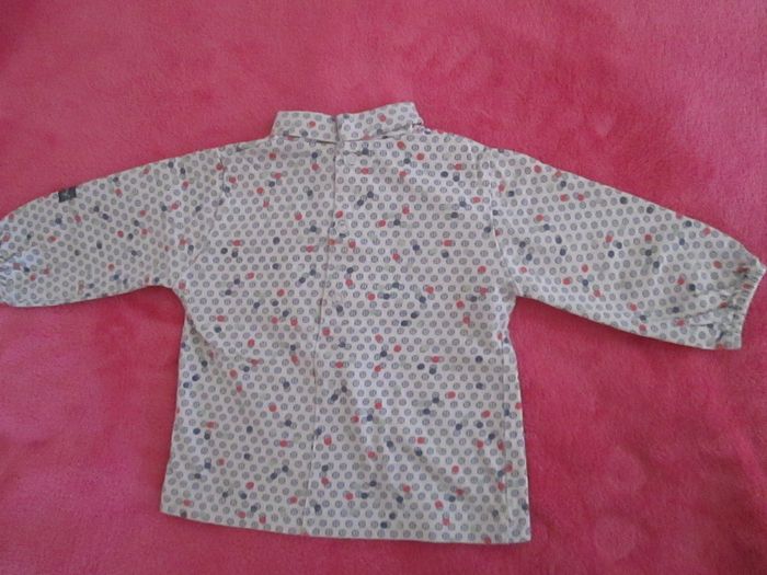 Vends tee-shirt Sucre d'Orge à petits motifs. S'attache avec des pressions dans le dos. Poignets resserrés avec des élastiques. 100 % coton. Taille 9 mois. Comme neuf. Pour plus de choix, allez consulter mes autres annonces.