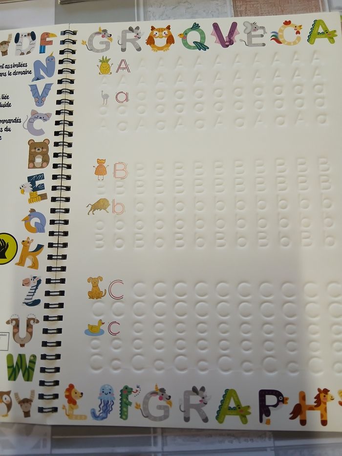 Pour apprendre à écrire et dessiner les lettres et chiffres En très bon état Très peu servi S’utilise avec des crayons dont l’encre s’efface toute seule