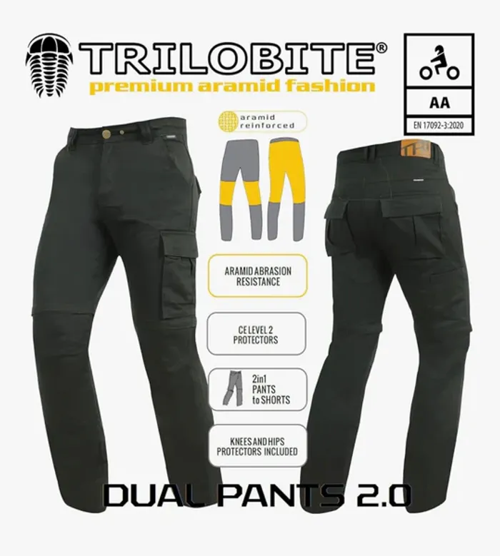 Pantalon de moto Trilobite Dual Pants 2.0 pour homme, conçu en 100% coton résistant. Taille mi-haute avec coupe jeans régulière, uni, idéal pour le printemps et l’été. Équipé de protections CE Niveau 2 pour genoux et hanches pour une sécurité optimale. Fermeture éclair pratique et confort adaptée aux trajets quotidiens ou sportifs. Caractéristiques : • Style : Pantalons de moto • Forme jambe : Pantalon • Type fermeture : Fermeture éclair • Saison : Printemps/été • Tranche d’âge : Adulte